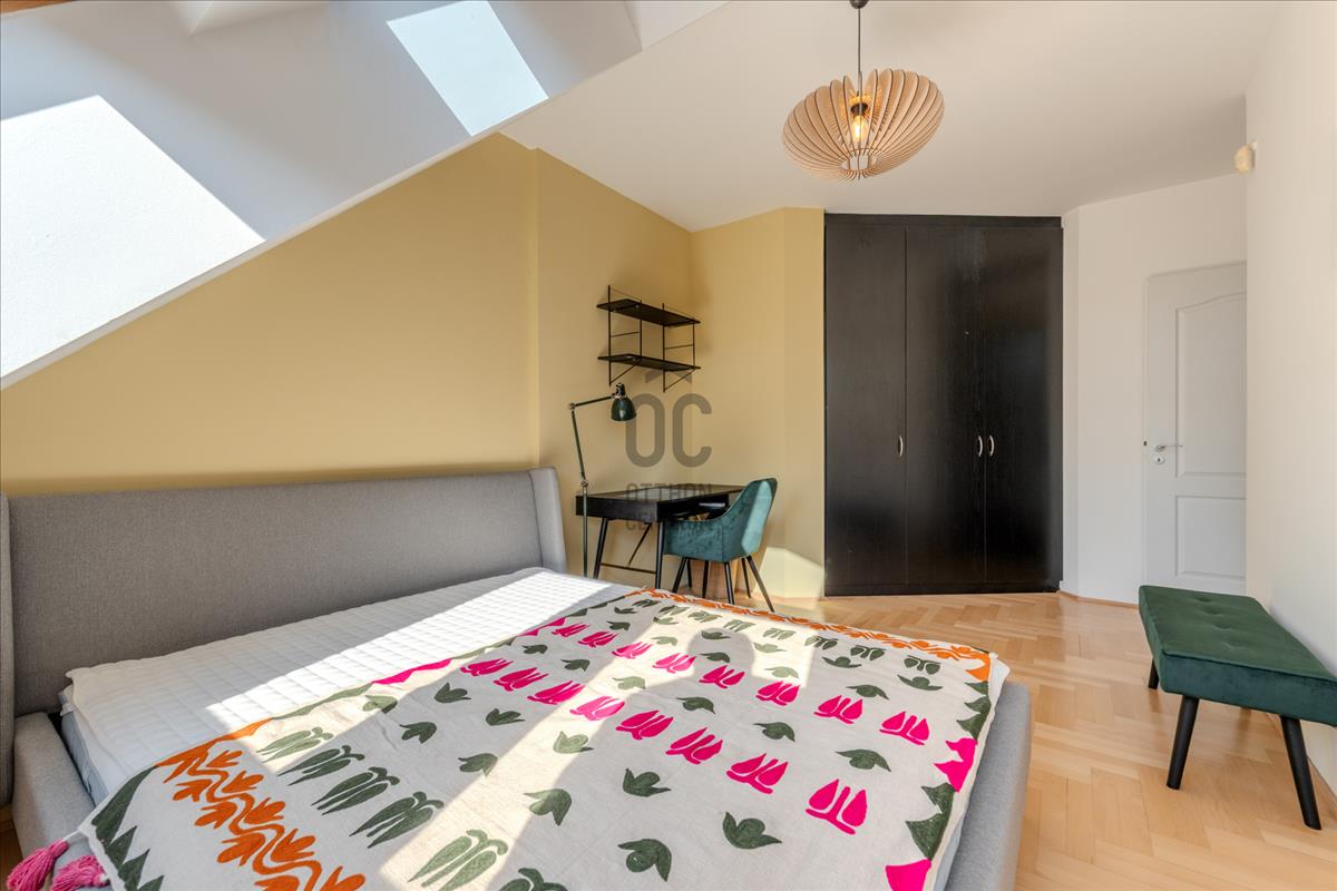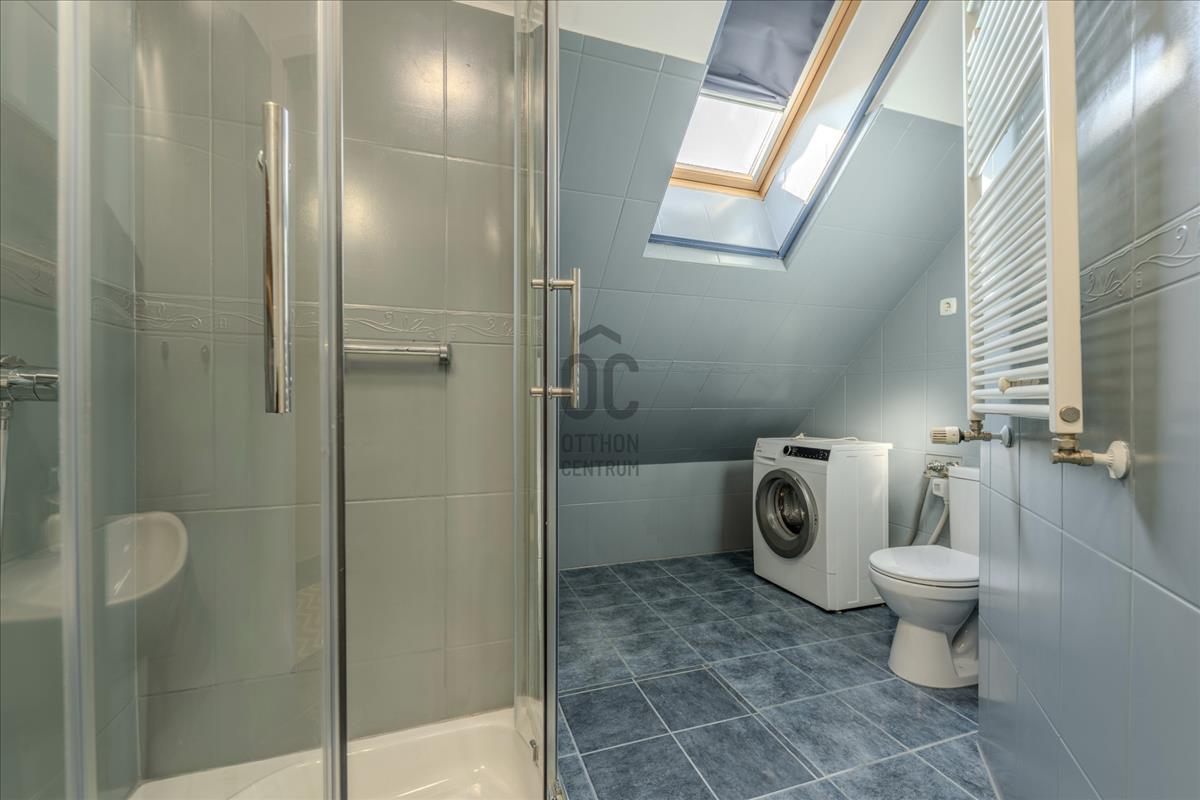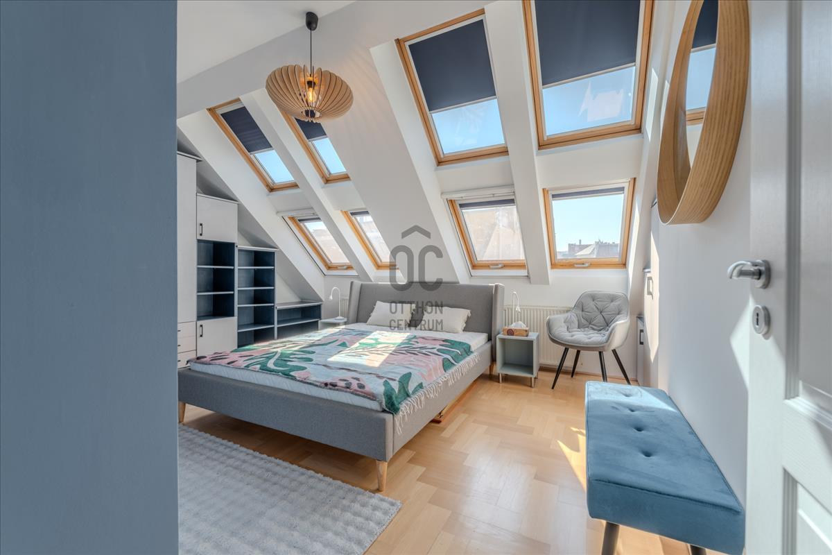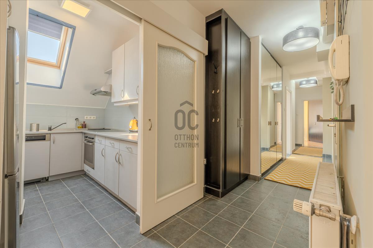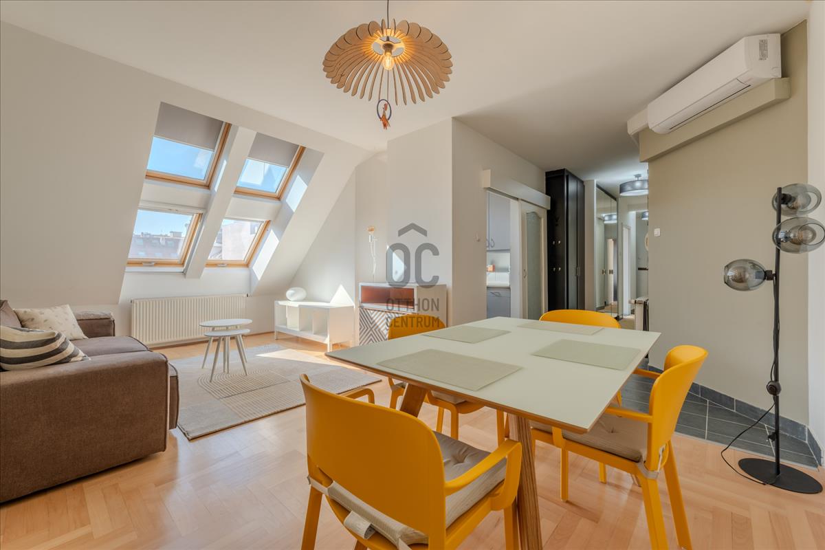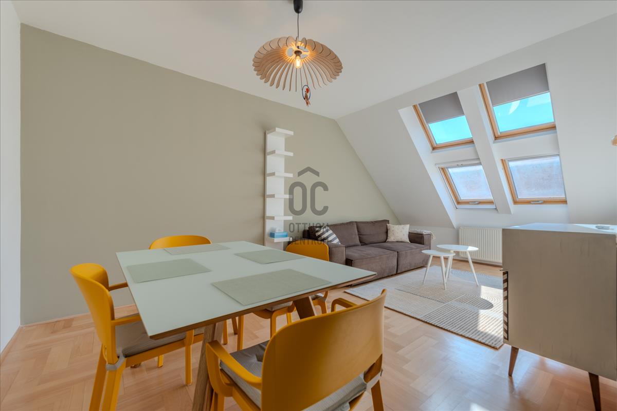 A lakás a társasház 5. emeletén (tetőtér) található, így a város felett, mégis a sűrűjében élhetsz.