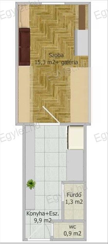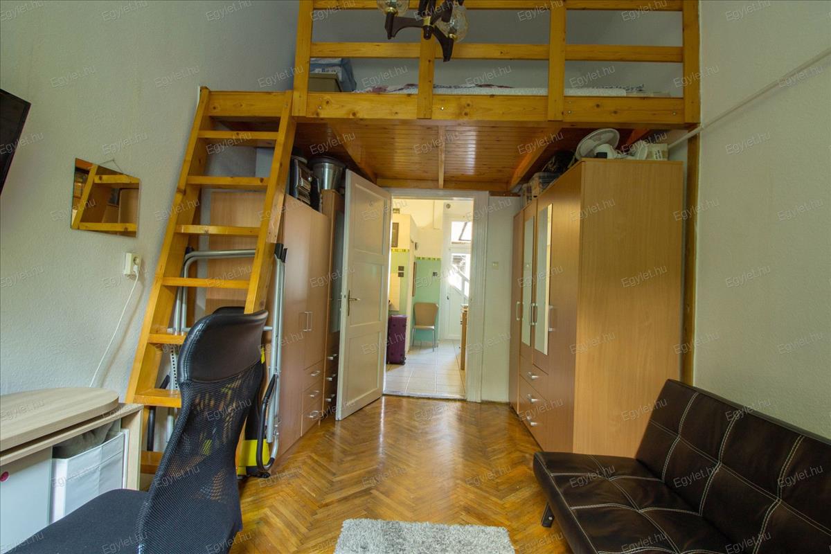 A szoba mérete: 15, 3 m2+ 6 m2 galéria. a nyílászárók jó állapotban vannak, a vezetékek cseréje azonban javasolt.