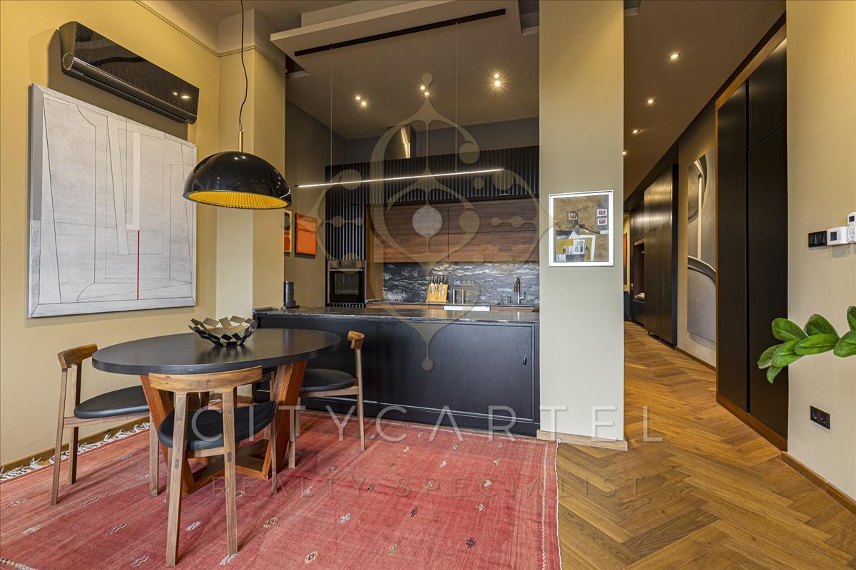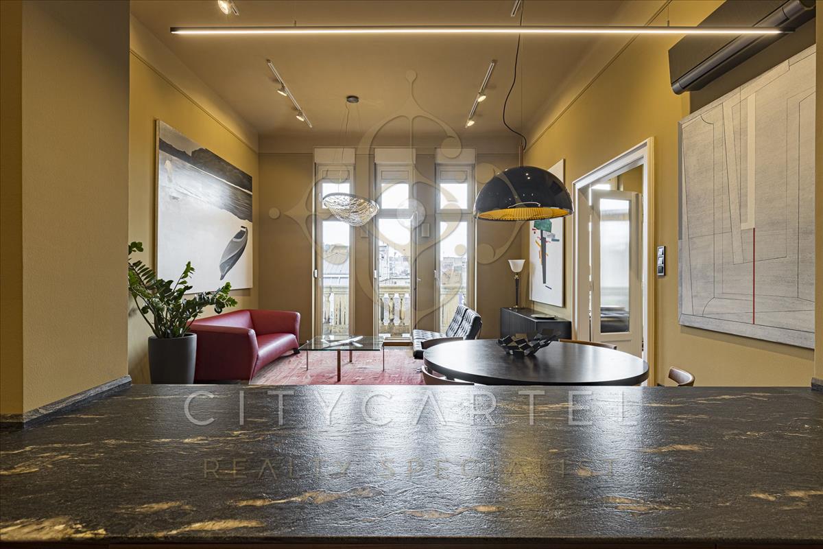 A tágas, fényárban úszó nappali egyedi design bútorokkal (Maxalto étkezőasztal, Rolf Benz kanapé, Barcelona fotel) lett berendezve, a reggeli kávénk elfogyasztása közben pedig az erkélyről szemlélhetjük a nyüzsgő belváros forgatagát.