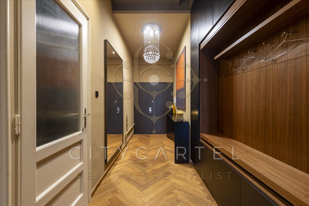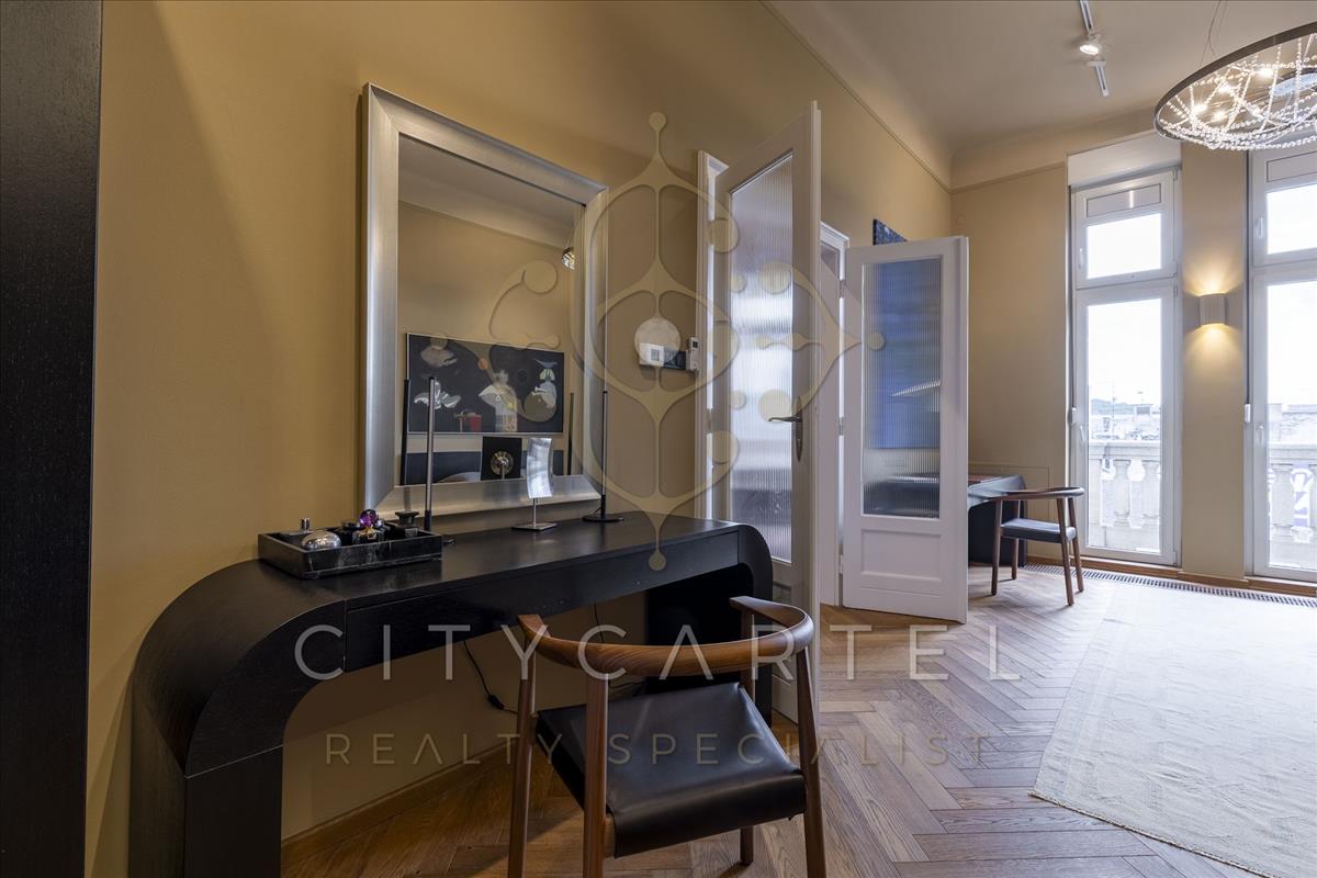 Astoriánál, a presztízs értékkel bíró, 1939-ben épült, különleges, dupla lépcsősoros, elegáns előtérrel és 2 lifttel rendelkező, art deco Georgia ház 6. emeletén az épület egyik legszebb, 2024-ben teljes körűen felújított, bruttó 124 nm-es, nappali + 2 hálószobás, duplakomfortos, gépesített és berendezett luxuslakása keresi leendő tulajdonosát.