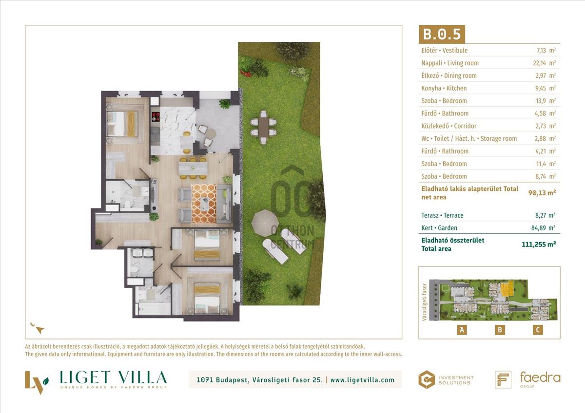 A pesti diplomatanegyed legszebb utcájában épül, a megjelenésében, műszaki tartalmában és a lakáskínálata tekintetében egyaránt unikális, Liget Villa Lakópark. Az épületbe érve, egy elegáns lobby és recepcióra érkezünk majd. Innen a három épületet egy kerti úton, passzázs köti majd össze. a tervezés során nagy hangsúlyt kapott a családi igényekre tervezett lakás minőségi használhatósága. Ablakos konyhák, master bedroom-ok, dupla fürdőszobák, gardrób és háztartási helyiségek is helyet kapnak a lakásban. Kiemelten jól bútorzható, két irányba tájolt lakások kerülnek kialakításra. a földszinti lakásokhoz 50-100 m2-es privát kertek, míg a közös területeken tájépítész által tervezett reprezentatív kertet alakítunk ki. a lakásokban mennyezeti hűtés-fűtés biztosítja a téli-nyári kellemes komfortérzetet. a nyílászárók 3 rétegű üveggel, alu-fa kivitelben kerülnek beépítésre. a lakások ára tartalmazza alapárban az alu elektromos redőnyöket és okosotthon kiépítést is. Magas minőségű olasz és spanyol hidegburkolatválasztékban akár 60x60 cm-es lapok is válaszhatóak majd. a fa parketta és az átlag feletti minőség szaniterek, szintén alapárban válaszhatóak a lakásokba. Az épületek alatti mélygarázsban gépkocsibeállók és tárolók kerülnek kialakításra.