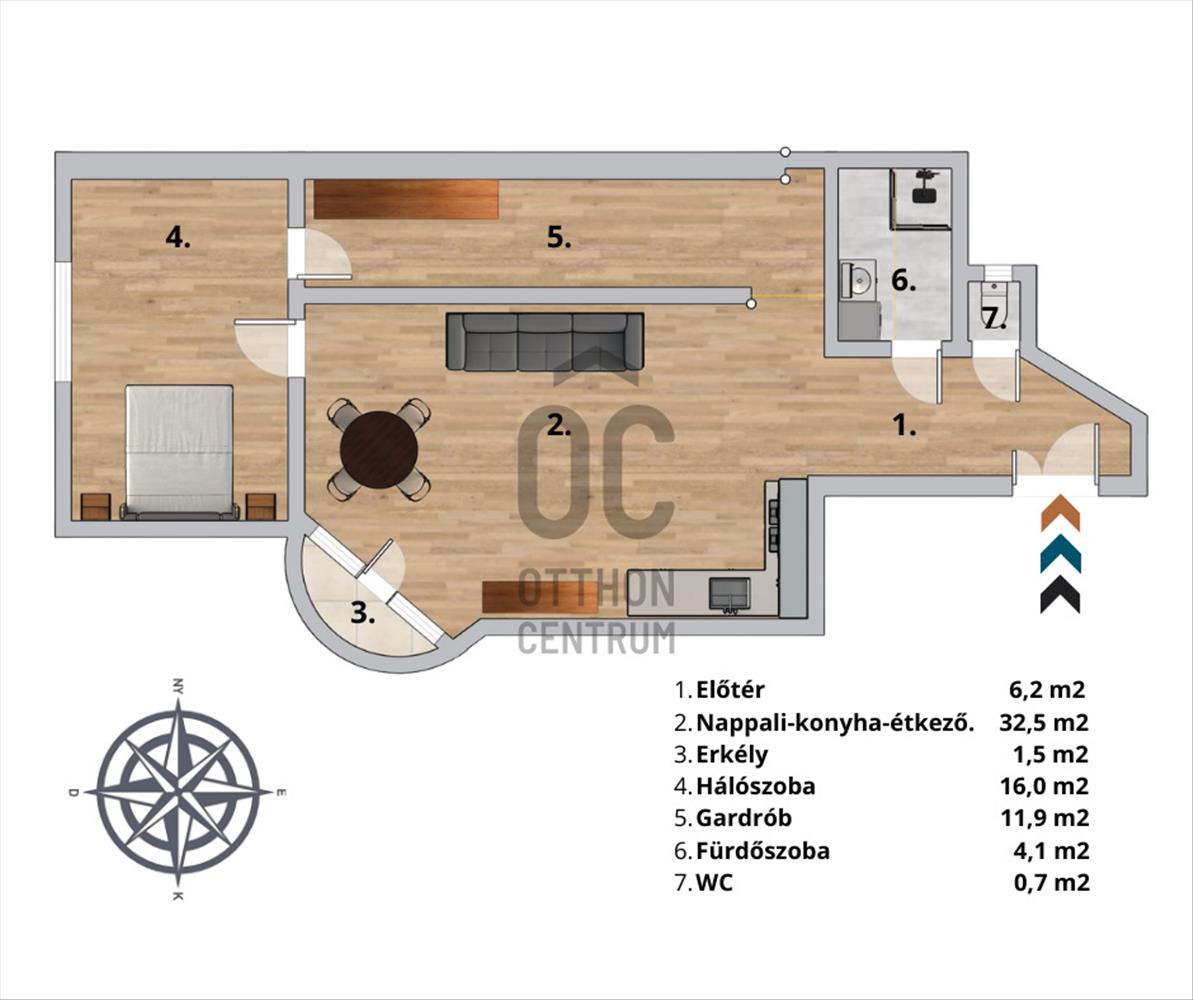 - Elosztása: előtér, amerikai konyhás nappali és étkező, gardrób, hálószoba, fürdőszoba, külön WC.