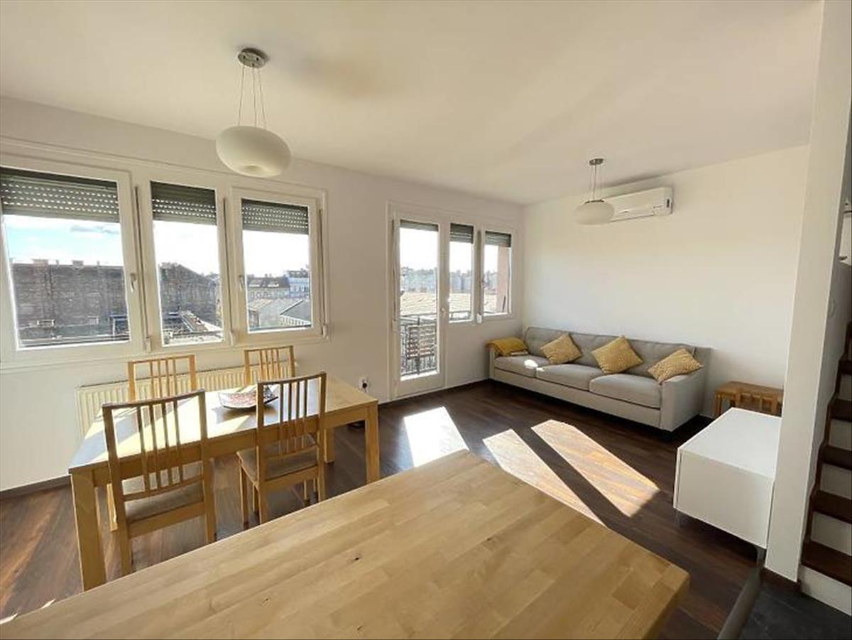 Eladó a VII. kerületben, a Jósika utcában, a Szenes Hanna park mellet egy igazán különleges hangulatú, panorámás kilátással rendelkező, nettó 60, bruttó pedig 80 nm -es, belső kétszintes (duplex) lakás egy 2007-ben épült, liftes társasház 5. emeletén.