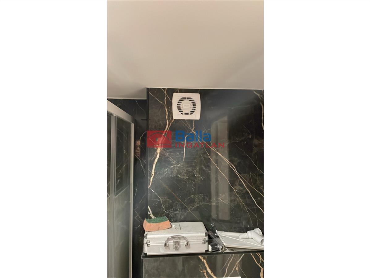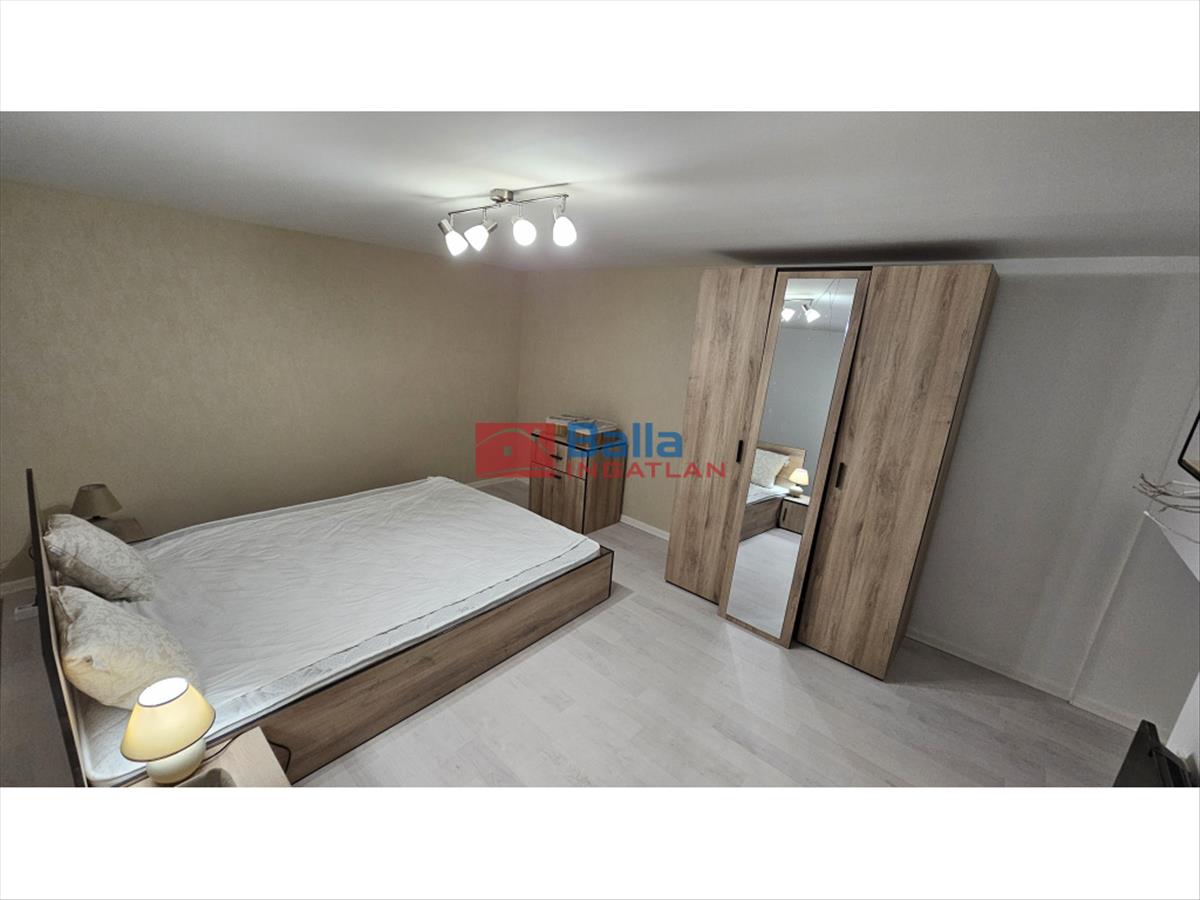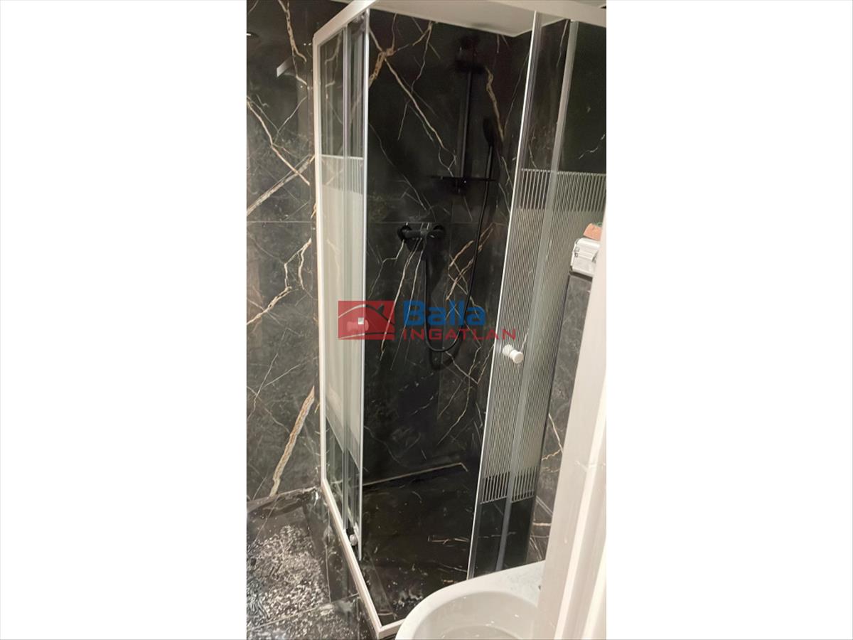 Fürdőszoba: épített zuhany + geberites Wc + villanybojler + törölközőszárító + mosdó szekrénnyel + tükör üvegpolccal.