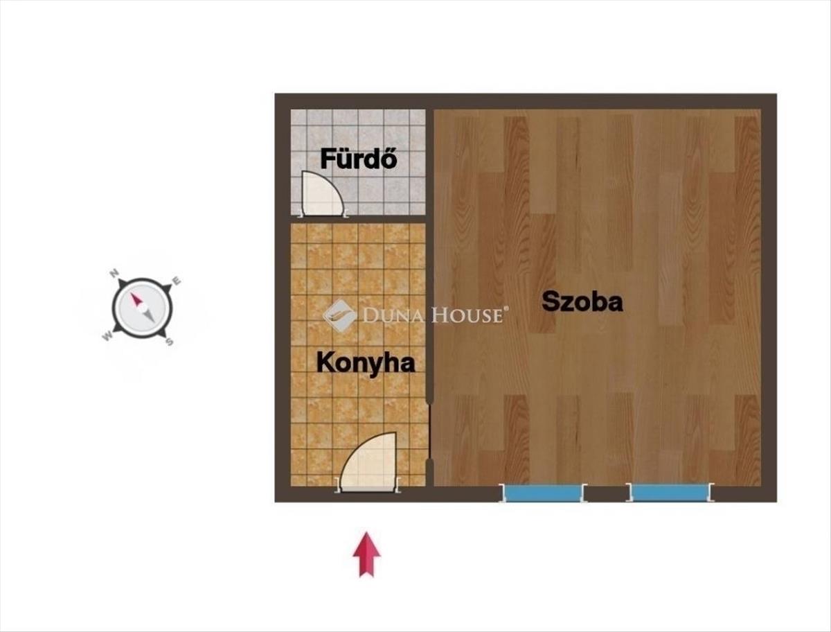 Helyiségek: nappali (22, 5 m²), konyha, fürdőszoba, külön WC/tároló (~1 m²)