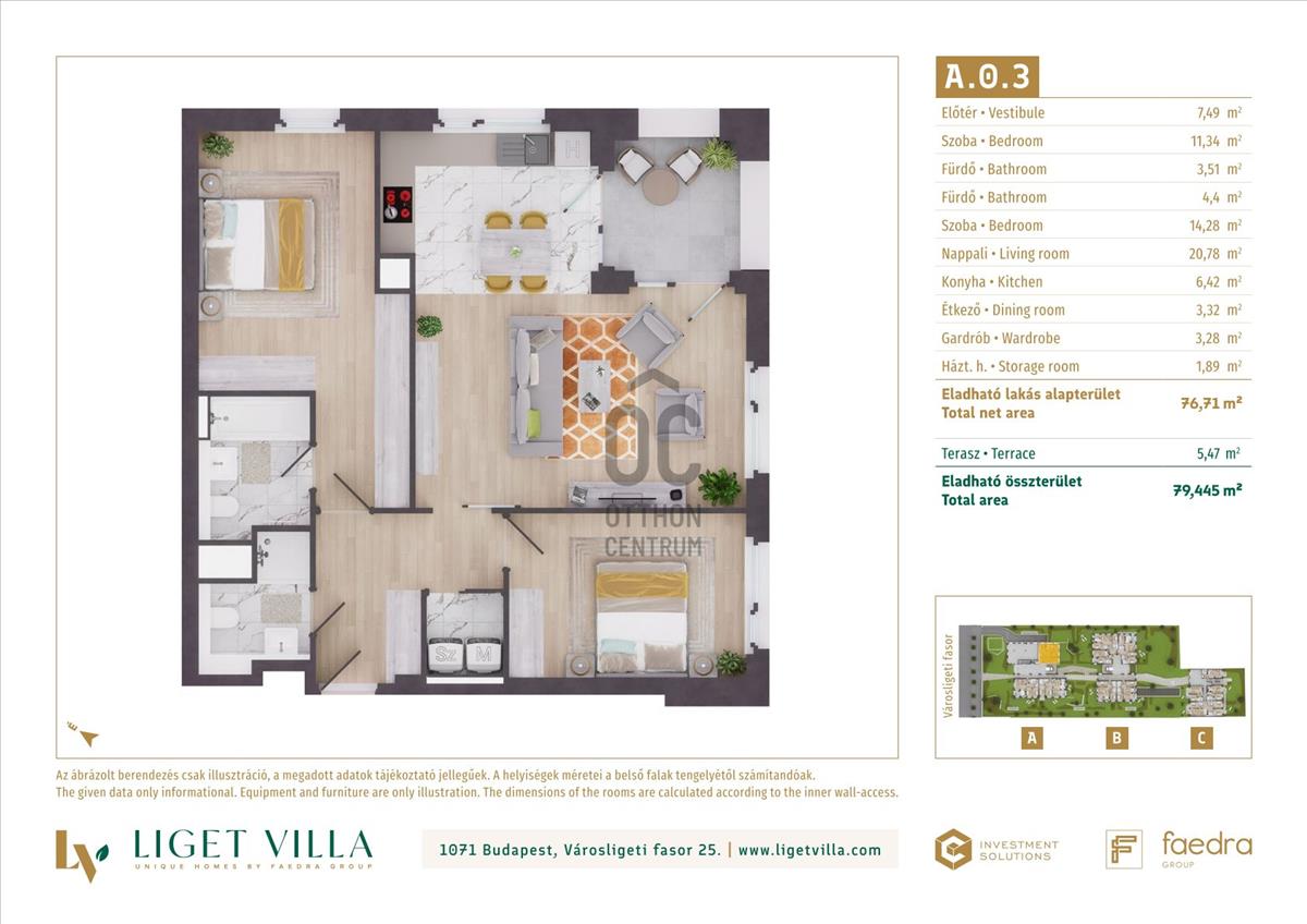 A pesti diplomatanegyed legszebb utcájában épül, a megjelenésében, műszaki tartalmában és a lakáskínálata tekintetében egyaránt unikális, Liget Villa Lakópark. Az épületbe érve, egy elegáns lobby és recepcióra érkezünk majd. Innen a három épületet egy kerti úton, passzázs köti majd össze. a tervezés során nagy hangsúlyt kapott a családi igényekre tervezett lakás minőségi használhatósága. Ablakos konyhák, master bedroom-ok, dupla fürdőszobák, gardrób és háztartási helyiségek is helyet kapnak a lakásban. Kiemelten jól bútorzható, két irányba tájolt lakások kerülnek kialakításra. a földszinti lakásokhoz 50-100 m2-es privát kertek, míg a közös területeken tájépítész által tervezett reprezentatív kertet alakítunk ki. a lakásokban mennyezeti hűtés-fűtés biztosítja a téli-nyári kellemes komfortérzetet. a nyílászárók 3 rétegű üveggel, alu-fa kivitelben kerülnek beépítésre. a lakások ára tartalmazza alapárban az alu elektromos redőnyöket és okosotthon kiépítést is. Magas minőségű olasz és spanyol hidegburkolatválasztékban akár 60x60 cm-es lapok is válaszhatóak majd. a fa parketta és az átlag feletti minőség szaniterek, szintén alapárban válaszhatóak a lakásokba. Az épületek alatti mélygarázsban gépkocsibeállók és tárolók kerülnek kialakításra.