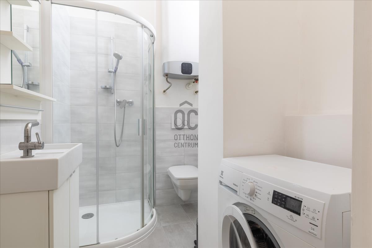 ➡️ a zuhanykabinnal és mosógéppel felszerelt fürdőszoba és a wc egy helyiségben kapott helyet.