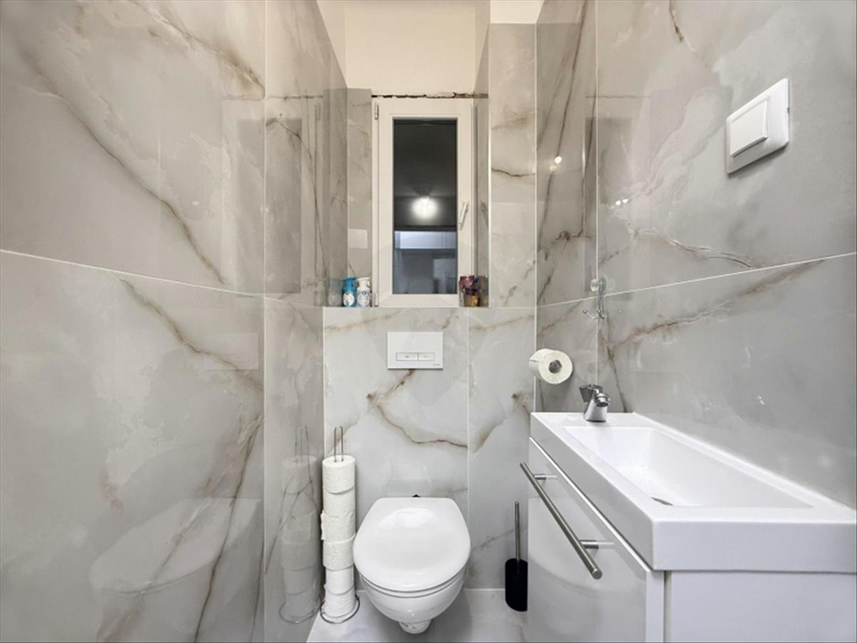 Modern, esztétikusan kialakított fürdőszoba és ízlésesen berendezett, részben bútorozott belső tér.