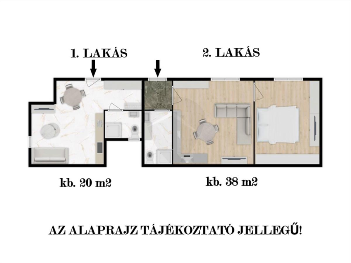 Az ingatlan könnyedén átalakítható két külön bejáratúvá, így akár két kisebb lakásként is funkcionálhat, ami kiváló lehetőséget nyújt rövid- vagy hosszú távú bérbeadásra.