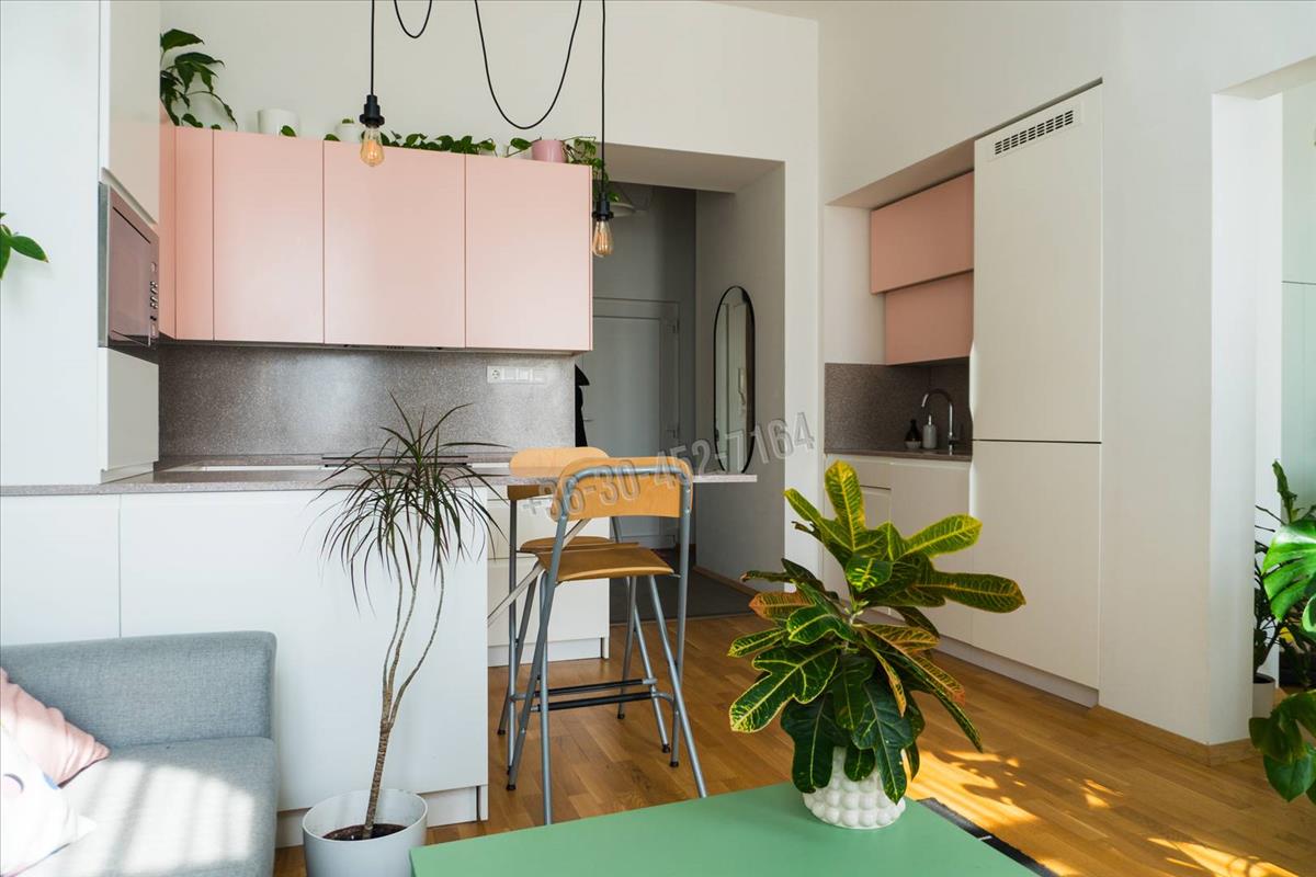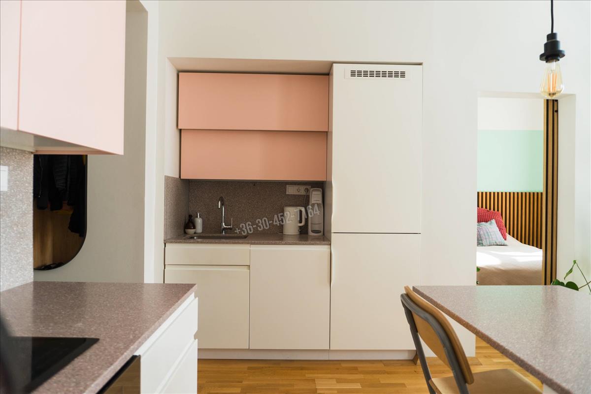 - a lakásban amerikai konyhás nappali lett kialakítva, a konyha bútor minőségi anyagokból, egyedileg gyártott, nem ikea konyha. a szekrények előlapjai festettek, a konyhapult 100%-ban vízálló műkő (nem bútorlap). Indukciós főzőlappal (Electrolux) valamit beépített sütővel (Ariston) és mikrohullámú sütővel (Ariston) lett felszerelve. Ezen kívül egy nagy (12 terítékes) mosogatógép (Hisense) és egy óriási hűtő-fagyasztó (Samsung) is megtalálható, mindkettő szintén gondosan beépítve a letisztult és elegáns designba illeszkedve.