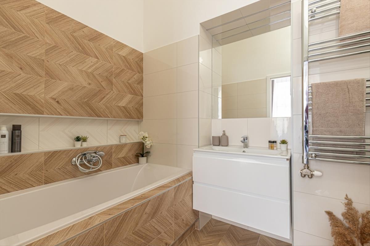 Az ingatlan 70 m²-es, és a terei zseniális újragondolásának köszönhetően helyet kapott benne egy tágas nappali-étkező-konyha, 2 hálószoba, 2 fürdőszoba, egy vendég wc és a megérkezéshez egy tágas előszoba.