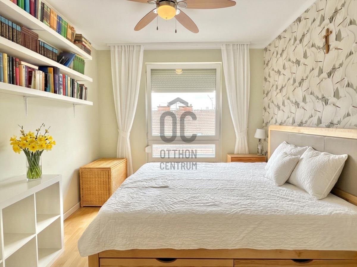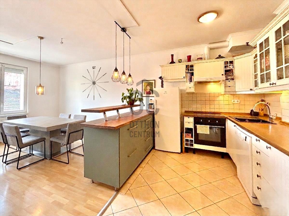 A 4 szoba kényelmes életteret biztosít minden családtagnak, a nagy ablakoknak köszönhetően a lakás kifejezetten napfényes, a mivel szemközti ház alacsonyabb az ingatlan kifejezzetten intim. Jelenlegi beosztása: nappali, lakókonyha, hálószoba, gyermekszoba, fürdőszoba, wc, közlekedő, terasz