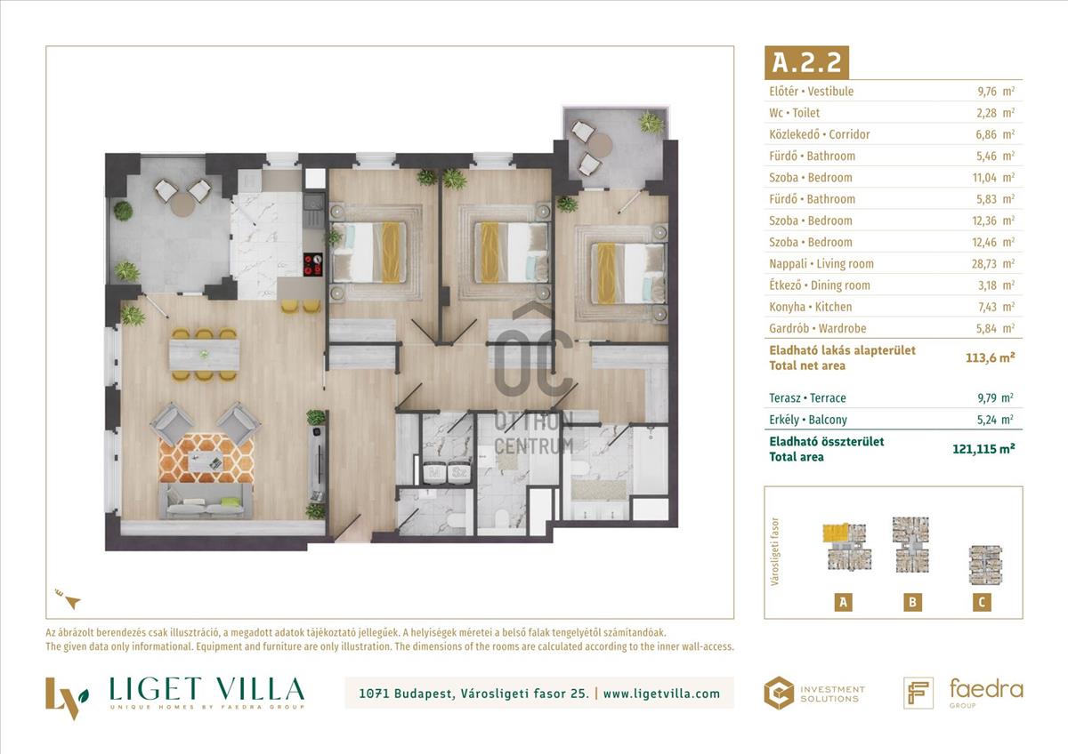A pesti diplomatanegyed legszebb utcájában épül, a megjelenésében, műszaki tartalmában és a lakáskínálata tekintetében egyaránt unikális, Liget Villa Lakópark. Az épületbe érve, egy elegáns lobby és recepcióra érkezünk majd. Innen a három épületet egy kerti úton, passzázs köti majd össze. a tervezés során nagy hangsúlyt kapott a családi igényekre tervezett lakás minőségi használhatósága. Ablakos konyhák, master bedroom-ok, dupla fürdőszobák, gardrób és háztartási helyiségek is helyet kapnak a lakásban. Kiemelten jól bútorzható, két irányba tájolt lakások kerülnek kialakításra. a földszinti lakásokhoz 50-100 m2-es privát kertek, míg a közös területeken tájépítész által tervezett reprezentatív kertet alakítunk ki. a lakásokban mennyezeti hűtés-fűtés biztosítja a téli-nyári kellemes komfortérzetet. a nyílászárók 3 rétegű üveggel, alu-fa kivitelben kerülnek beépítésre. a lakások ára tartalmazza alapárban az alu elektromos redőnyöket és okosotthon kiépítést is. Magas minőségű olasz és spanyol hidegburkolatválasztékban akár 60x60 cm-es lapok is válaszhatóak majd. a fa parketta és az átlag feletti minőség szaniterek, szintén alapárban válaszhatóak a lakásokba. Az épületek alatti mélygarázsban gépkocsibeállók és tárolók kerülnek kialakításra.
