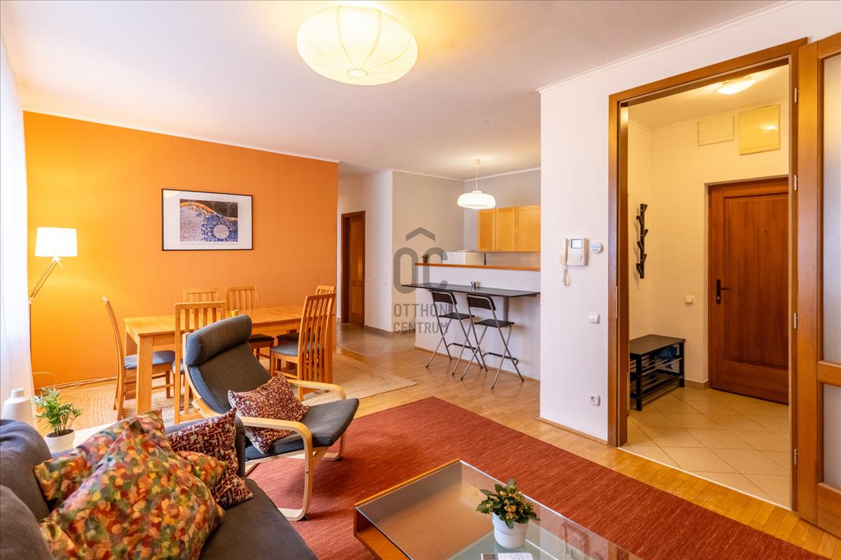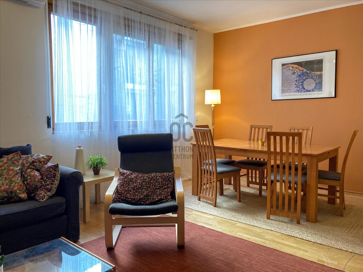 Kiemelten népszerű környéken, modern, dekoratív házban, remek adottságú, kedvező rezsijű, bútorozott, gépesített konyhás, nappali plusz két hálószobás lakás eladó, kényelmes teremgarázs hellyel.