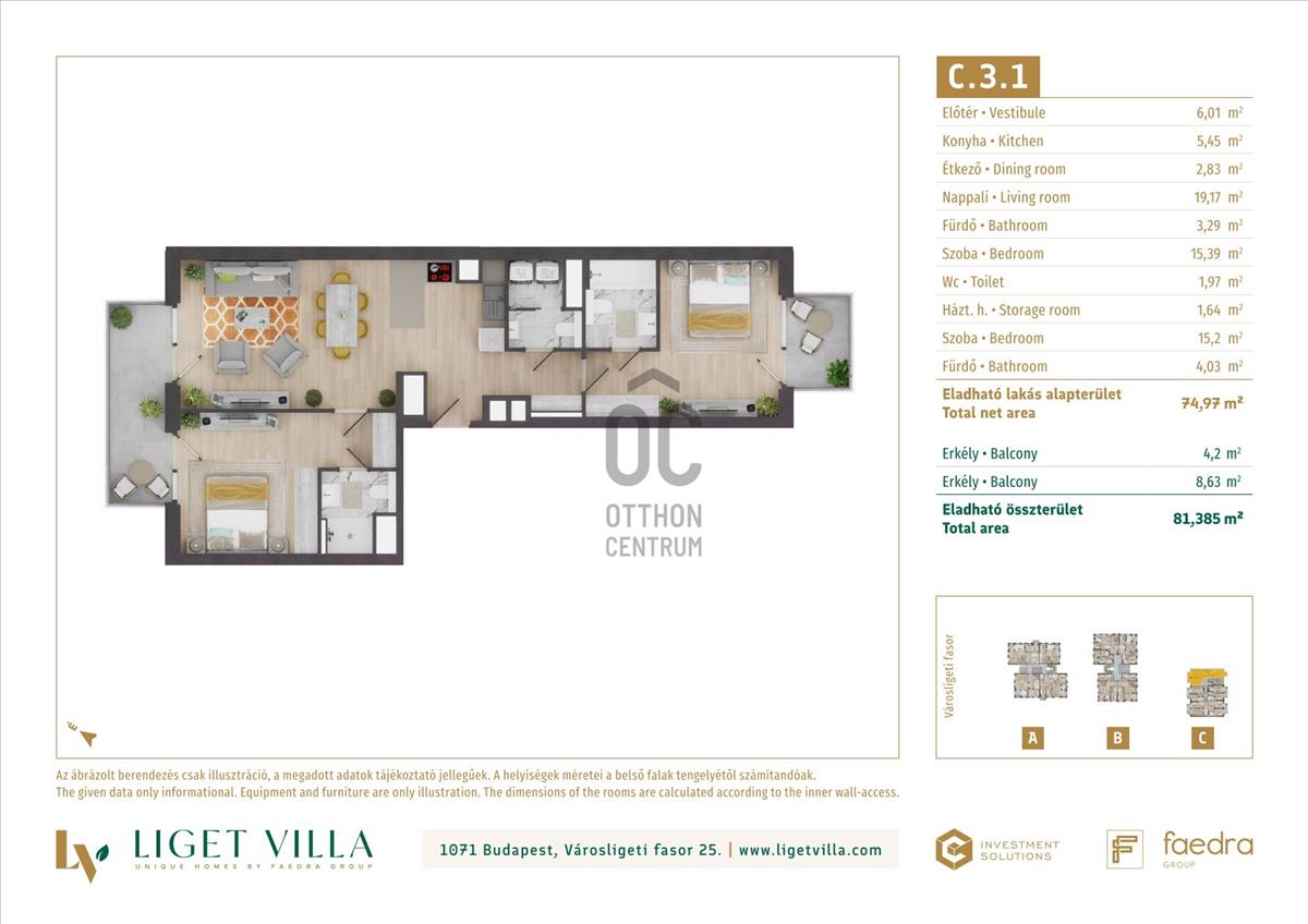 A pesti diplomatanegyed legszebb utcájában épül, a megjelenésében, műszaki tartalmában és a lakáskínálata tekintetében egyaránt unikális, Liget Villa Lakópark. Az épületbe érve, egy elegáns lobby és recepcióra érkezünk majd. Innen a három épületet egy kerti úton, passzázs köti majd össze. a tervezés során nagy hangsúlyt kapott a családi igényekre tervezett lakás minőségi használhatósága. Ablakos konyhák, master bedroom-ok, dupla fürdőszobák, gardrób és háztartási helyiségek is helyet kapnak a lakásban. Kiemelten jól bútorzható, két irányba tájolt lakások kerülnek kialakításra. a földszinti lakásokhoz 50-100 m2-es privát kertek, míg a közös területeken tájépítész által tervezett reprezentatív kertet alakítunk ki. a lakásokban mennyezeti hűtés-fűtés biztosítja a téli-nyári kellemes komfortérzetet. a nyílászárók 3 rétegű üveggel, alu-fa kivitelben kerülnek beépítésre. a lakások ára tartalmazza alapárban az alu elektromos redőnyöket és okosotthon kiépítést is. Magas minőségű olasz és spanyol hidegburkolatválasztékban akár 60x60 cm-es lapok is válaszhatóak majd. a fa parketta és az átlag feletti minőség szaniterek, szintén alapárban válaszhatóak a lakásokba. Az épületek alatti mélygarázsban gépkocsibeállók és tárolók kerülnek kialakításra.
