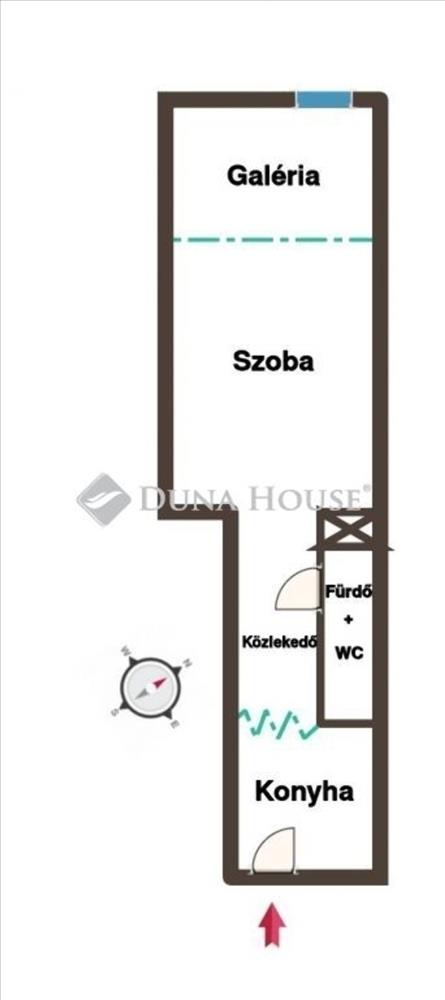 A bejárati ajtón belépve a konyhába érkezünk, innen beljebb haladva egy közlekedő vezet tovább. Jobb kézre található a fürdőszoba WC-vel, egyenesen előre pedig a tágas szoba, amelyet galéria egészít ki, így a belmagasságot maximálisan kihasználva praktikus és otthonos megoldást kínál.
