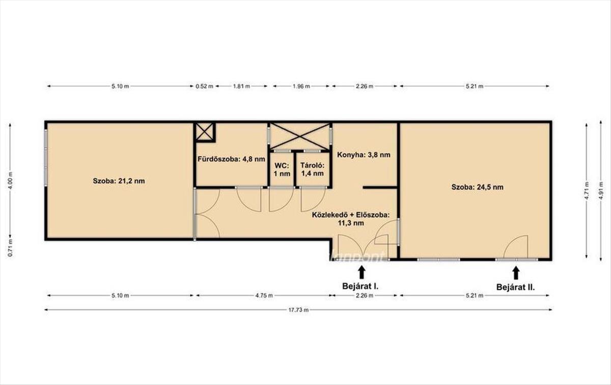 A lakás elosztása kedvező. Jelenleg két külön nyíló szoba, konyha, külön fürdőszoba és wc, valamint egy tároló helyiség található benne. Az ingatlan különlegessége, hogy két bejárattal rendelkezik, így könnyen két külön lakássá alakítható. Ezáltal saját otthonnak és befektetésnek is jó lehetőség.