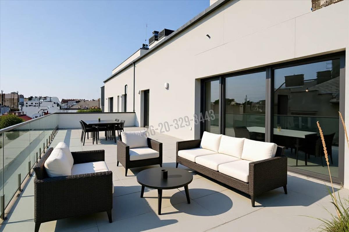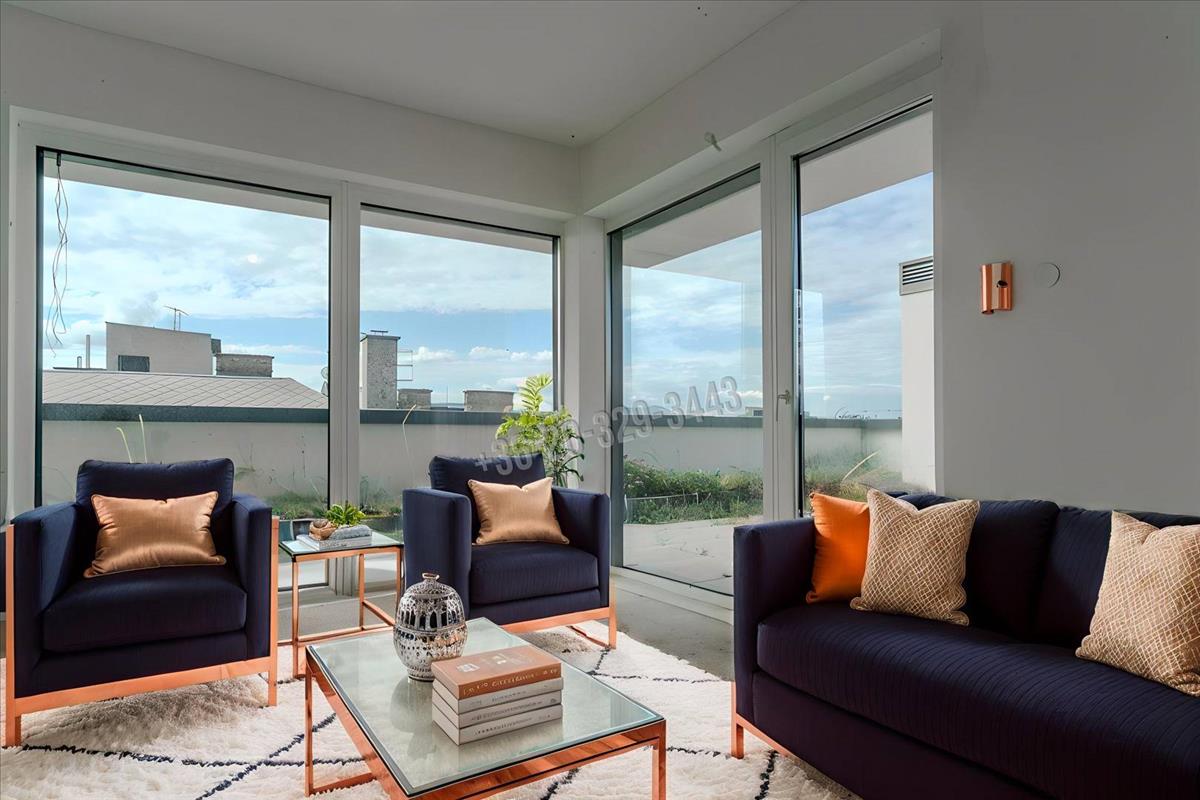 The huge balcony windows and doors on the lower level also offer a splendid panoramic view from the living room. There are plenty of opportunities to set up the 79 sqm recreational and panoramic terrace in reality, with built-in electrical and water connections.
