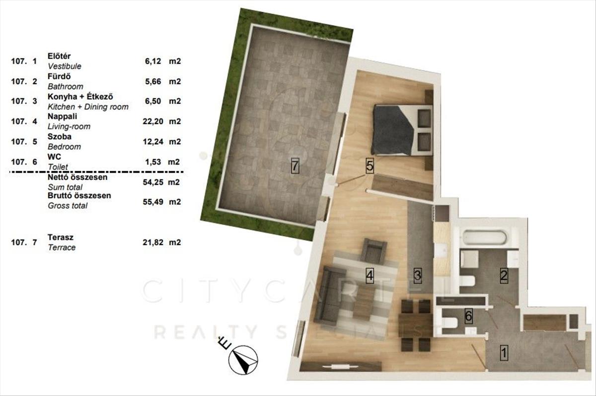 A liftes társasház 1. emeletén található, 58, 23 nm -es, (54, 25 nm lakás 21, 82 nm terasszal) 2 szobás lakás korszerű hőszivattyús fűtés–hűtéssel és teljes körű okosotthon-rendszerrel felszerelve várja új tulajdonosát. a burkolatok még választhatók, így a leendő tulajdonos saját ízlésére szabhatja az ingatlant.