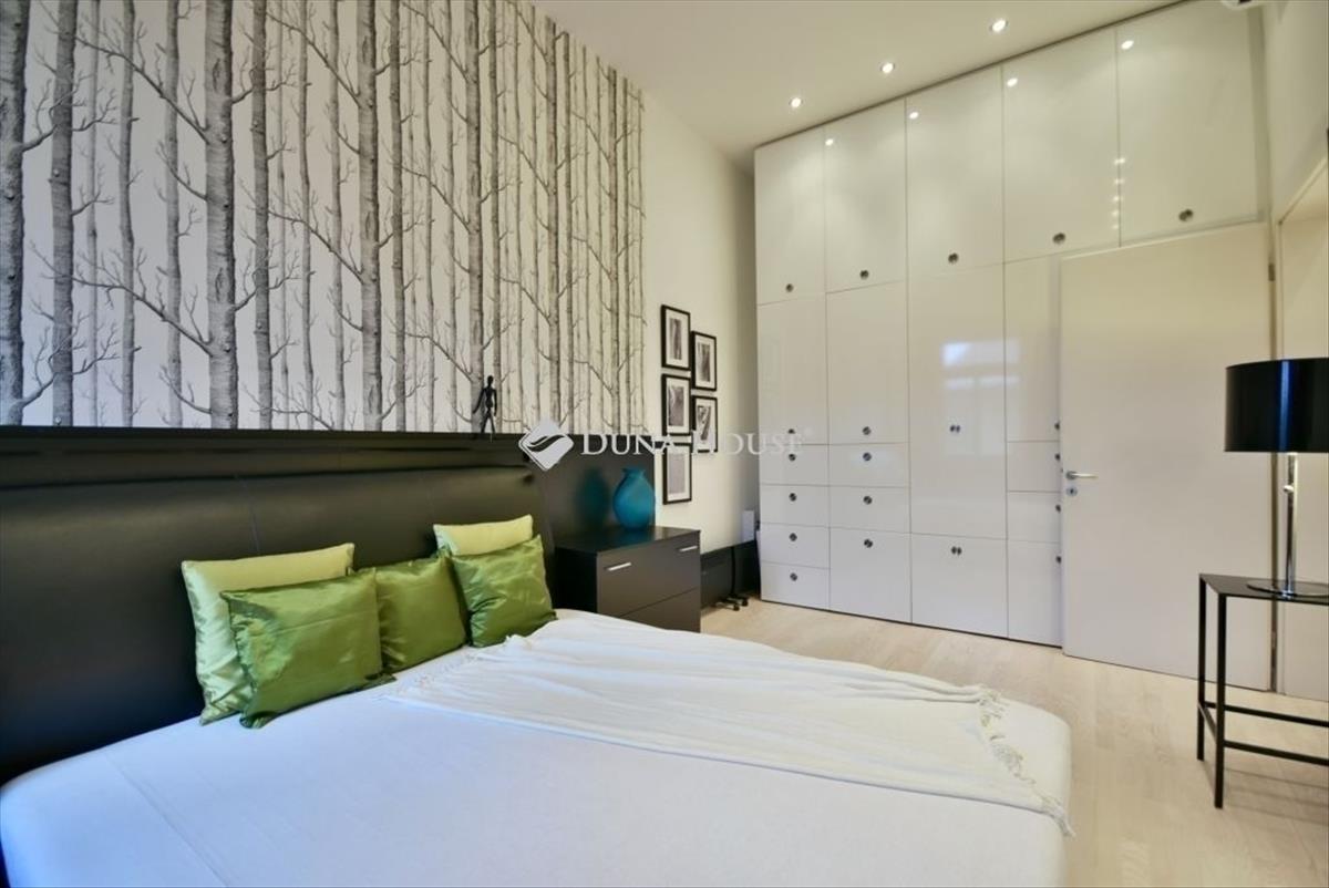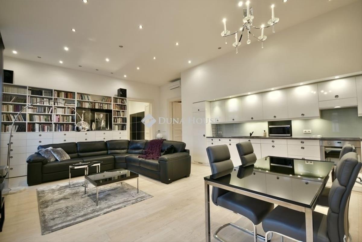 A lakás legfelső emeleti, liftes társasházban található. Központi tere egy közel 50 m²-es amerikai konyhás nappali, amely valódi nagypolgári térérzetet biztosít, ugyanakkor modern, minimalista kialakítású.