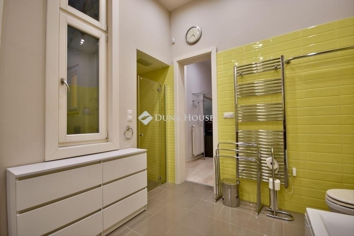 A fürdőszoba kifejezetten tágas, igényes kialakítású, fürdőkáddal, külön zuhanyzóval és bidés WC-vel felszerelt. Ezen felül a lakásban található külön vendégmosdó, valamint külön vendég wc is, ami akár családi használat, akár irodai vagy rendelői funkció esetén jelentős előnyt jelent.