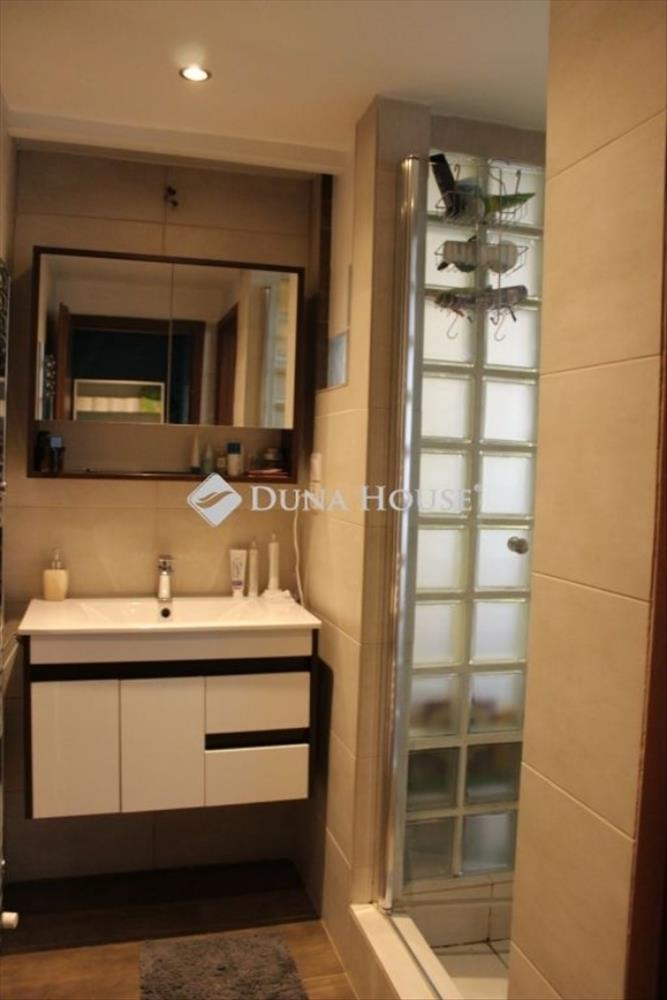 A földszinten található továbbá egy külön szoba, amely akár második nappaliként vagy vendégszobaként is funkcionálhat, valamint egy különleges kialakítású fürdőszoba, melyet félköríves, üvegtéglás fal határol. Ez nemcsak esztétikus, de lehetővé teszi a természetes fény beáramlását, miközben megőrzi a privát szférát a lakás igazi ékköve!