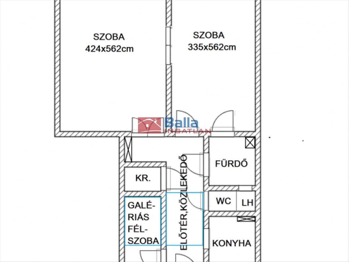 Két nagy külön nyíló szobája utcai nézetű, keleti tájolású, nagyobbik légkondicionált. a legkisebb szoba lakóterét galéria bővíti. Konyhája ablakos, kisebb családi étkezésre is alkalmas. Fürdőszoba ablakos, és toalett is, ami külön helyiségben található. Kamrája, és az előszobában egy galéria adja a kényelmes tárolási lehetőséget, valamint egy pince.