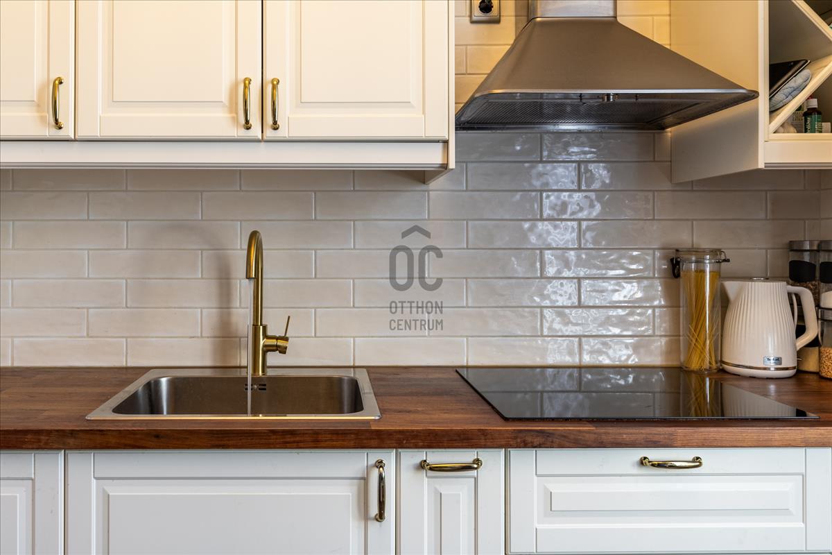 A konyha teljesen gépesített, modern kialakítású, világos, és ablakának köszönhetően könnyen szellőztethető, ami a mindennapi használat során kifejezetten praktikus.