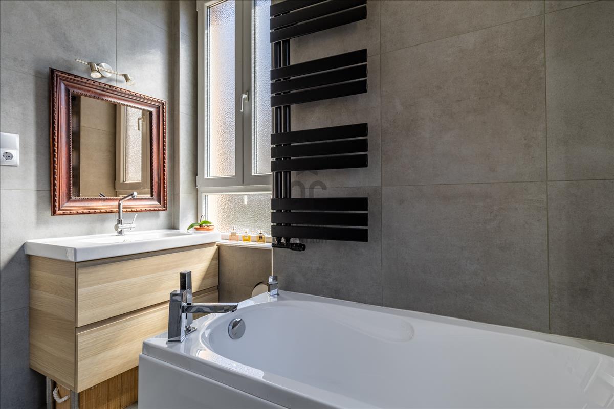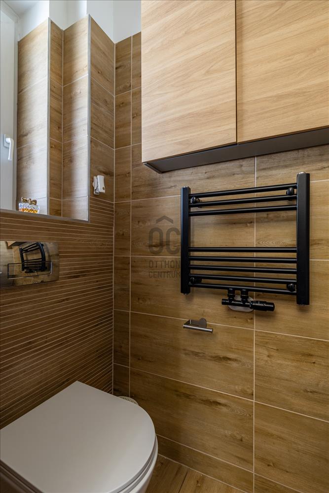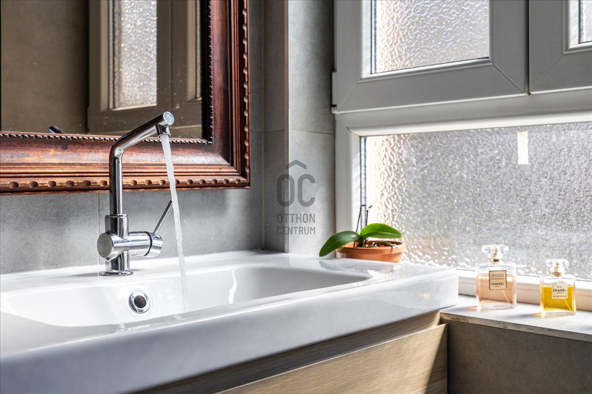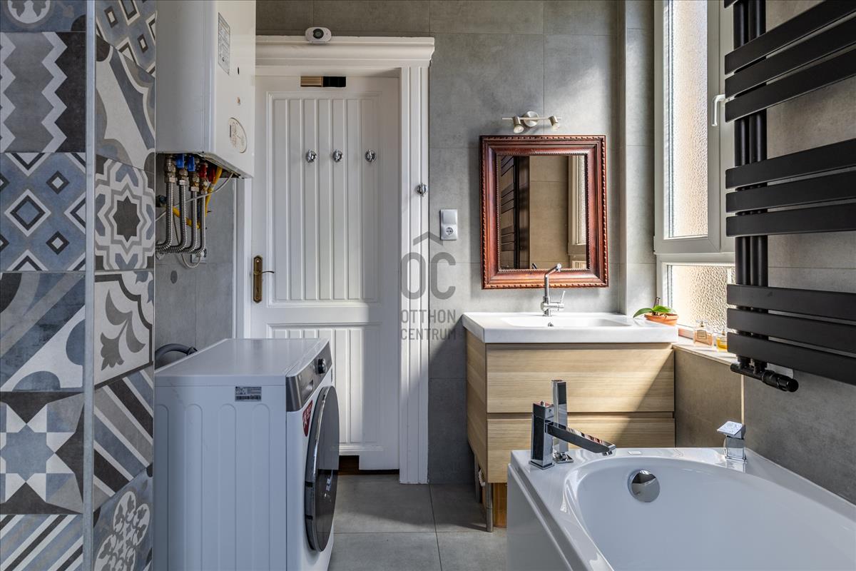 A fürdőszoba kifejezetten tágas és világos, zuhanyzóval és káddal egyaránt felszerelt, ráadásul két ablakkal is rendelkezik, így természetesen szellőztethető. a mellékhelyiség külön helyiségben kapott helyet, amely szintén ablakos – ez ritkaságnak számít. a fürdőben új szaniterek kerültek beépítésre, így modern és igényes kialakítás jellemzi.