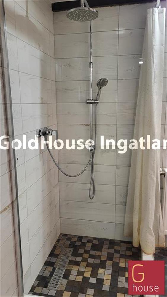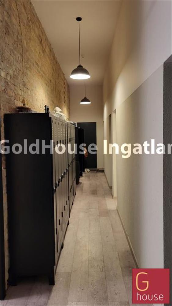 The apartment is situated on the second floor of a well-maintained building with an elevator and stable financial background. It features six separate, street-facing rooms accessible from a shared corridor, two bathrooms each equipped with two showers and two sinks, and three separate toilets. The spacious kitchen doubles as a communal area and connects to the laundry room and one of the bathrooms, with additional gallery space above.