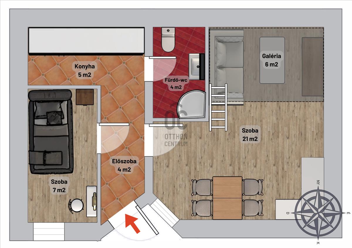 ➡️ Jelenlegi felosztása: előszoba, fekvő galériás nappali - étkező, hálószoba, konyha, fürdőszoba-wc.