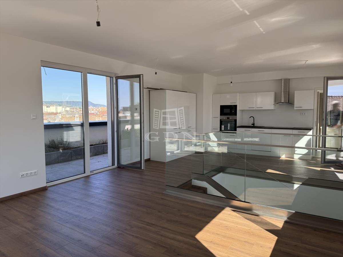 VIII. kerület csendes, mégis központi részén, új építésű ház legfelső szintjén kínálunk megvételre egy belső kétszintes, kulcsrakész, penthouse lakást, páratlan kilátással a Gellért-hegyre és a Hármashatár-hegyre, az alábbi paraméterekkel: