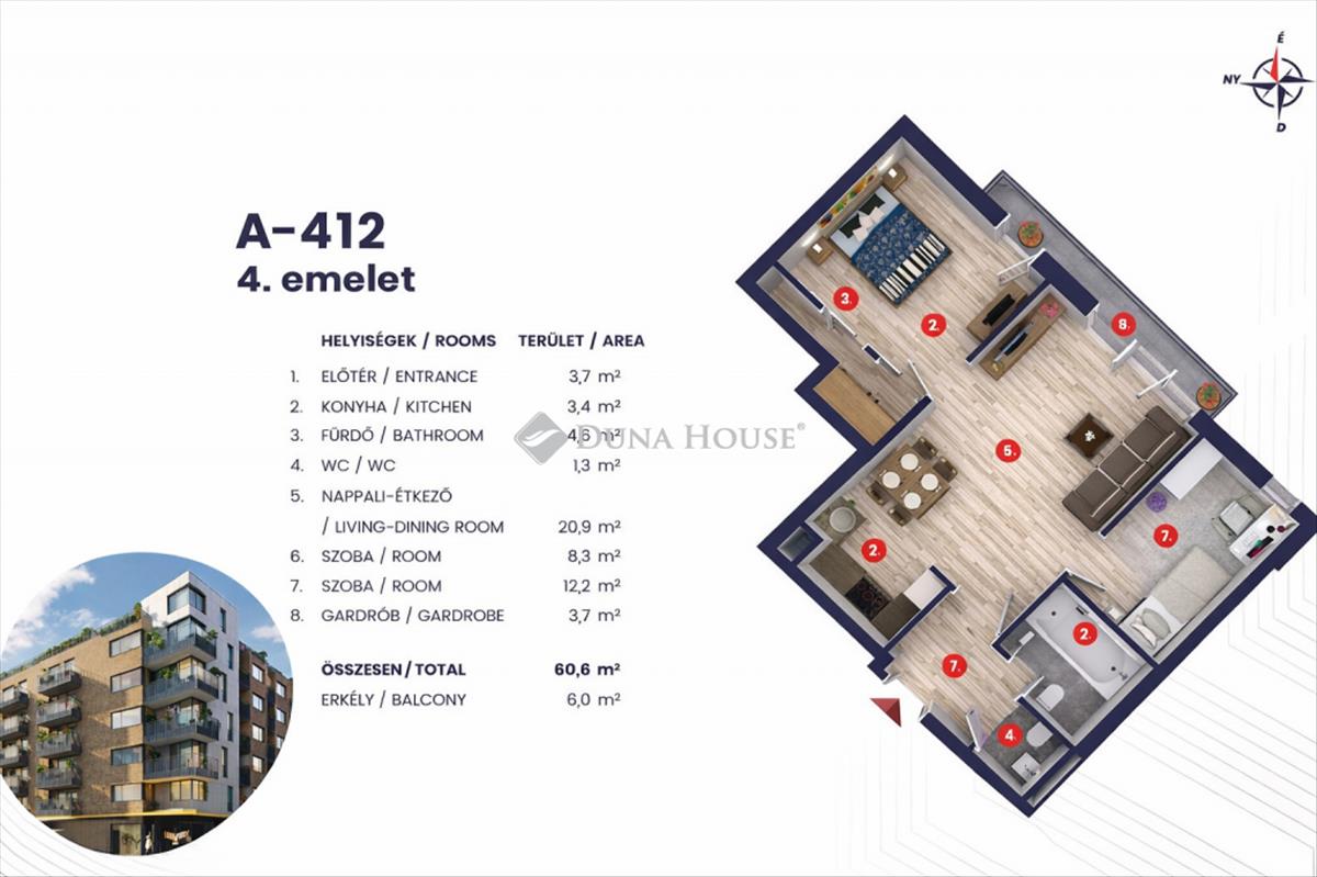 Eladó egy 2025-ben épült, modern társasház 4. emeletén található, 58 m²-es, világos, kiváló elosztású lakás 6 m²-es erkéllyel. a lakás eddig nem volt lakva, így Ön lehet az első beköltöző!