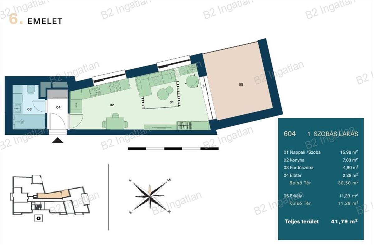 A  lakás belső alapterülete 30, 50 m², amelyhez egy 11, 29 m²-es, jól használható erkély kapcsolódik, így a teljes terület 41, 79 m². a lakás jelenlegi kialakítása 1 szobás, ugyanakkor a nappaliból könnyedén leválasztható egy külön hálószoba, így még praktikusabban alakítható az élettér. További különleges lehetőség, hogy a használatbavételi engedély megszerzését követően az erkély is beépíthető, így akár további hálószobaként vagy bővített lakótérként is hasznosítható.