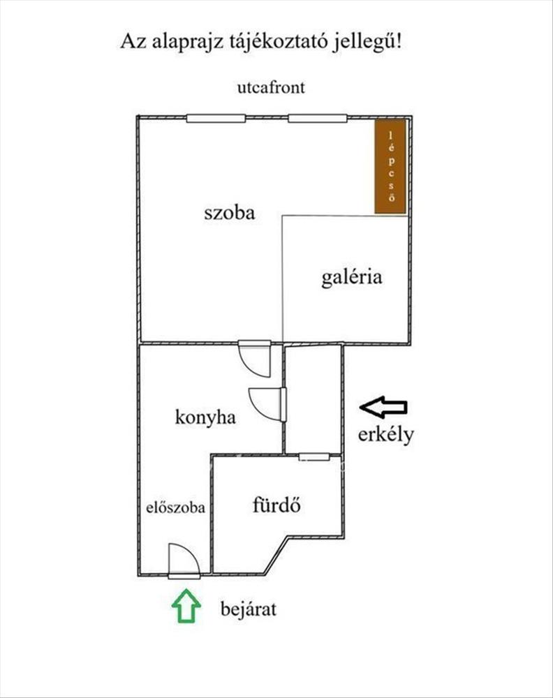 A lakás egy lift nélküli társasház III. emeletén található. Az ingatlan 3, 6 m belmagasságának köszönhetően a szobában egy 6 nm-es fekvőgaléria került beépítésre. a lakáshoz tartozik egy folyosóról megközelíthető 1, 2 nm alapterületű mosókonyha, illetve a pinceszinten egy 6 nm-es zárt pincerész is.