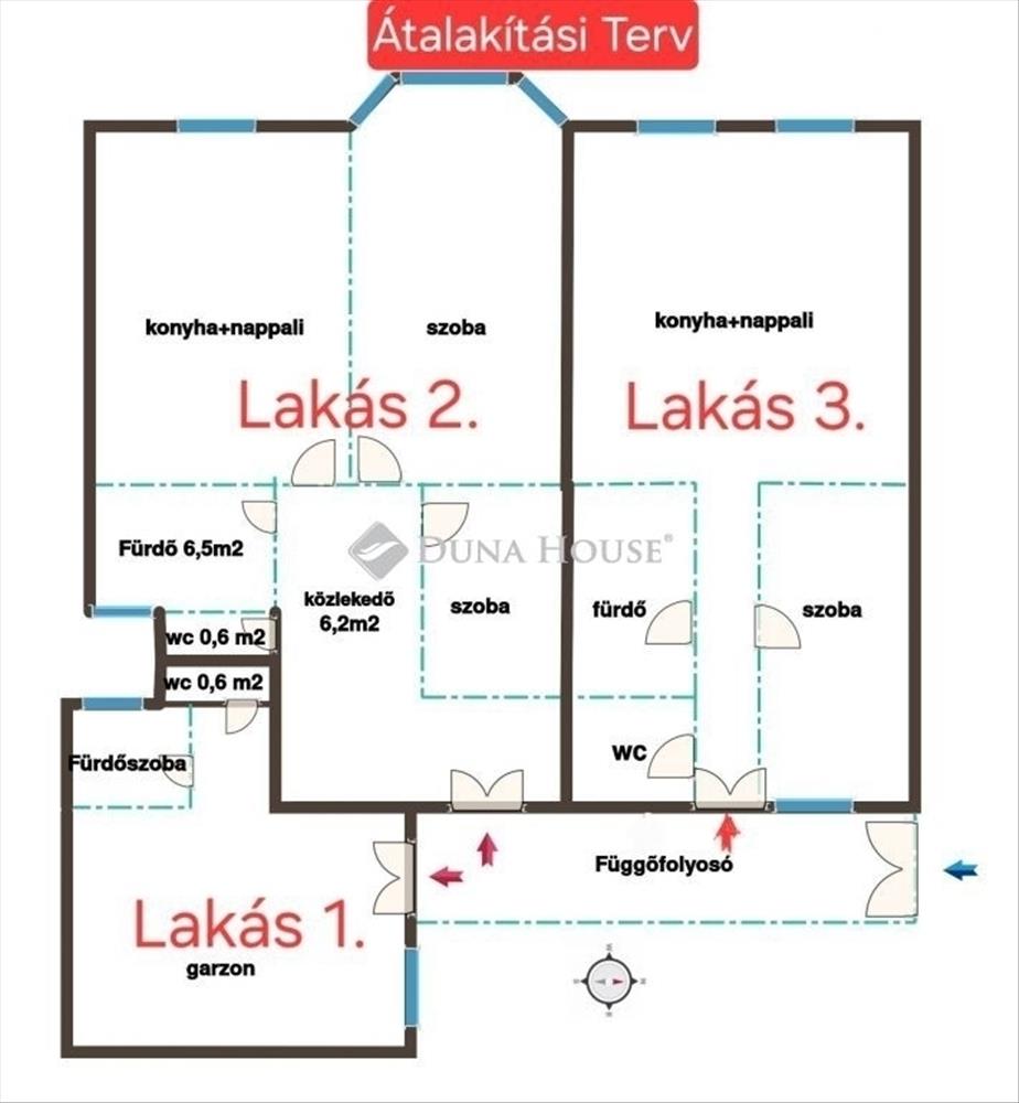 A függőfolyosóra néző ablakok ajtóvá alakíthatók, így akár 3 külön bejárat is kialakítható. Ezzel a lakás 3–4 önálló egységgé bontható, ami ebben a lokációban stabil, gyorsan kiadható portfóliót jelent.