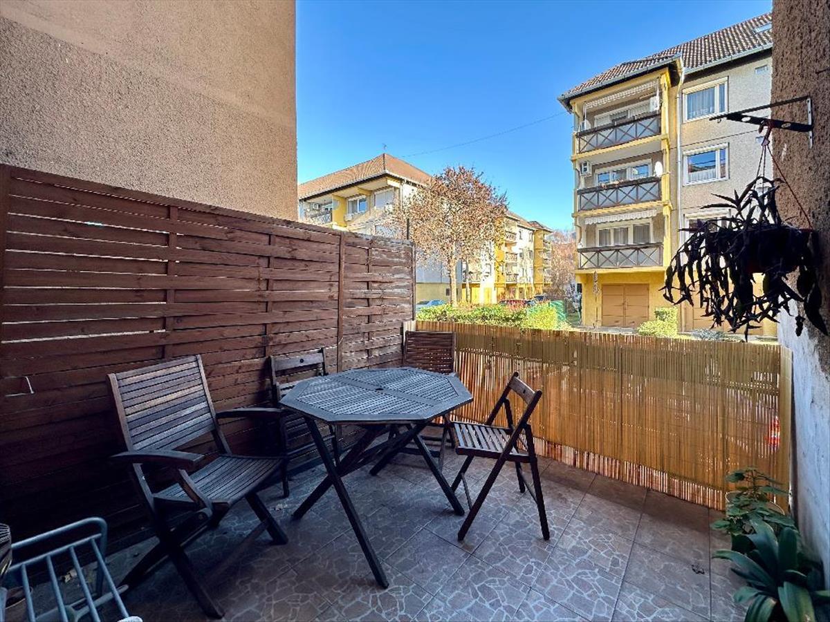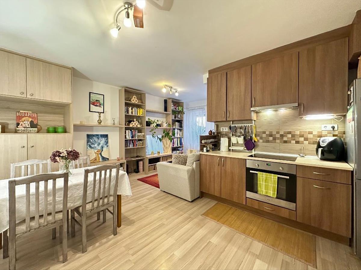 Eladó a Századosnegyedben egy jó állapotú, 55 nm-es, amerikai konyhás nappali + 2 szobás, földszinti lakás terasszal, tárolóval (8, 8 nm).
