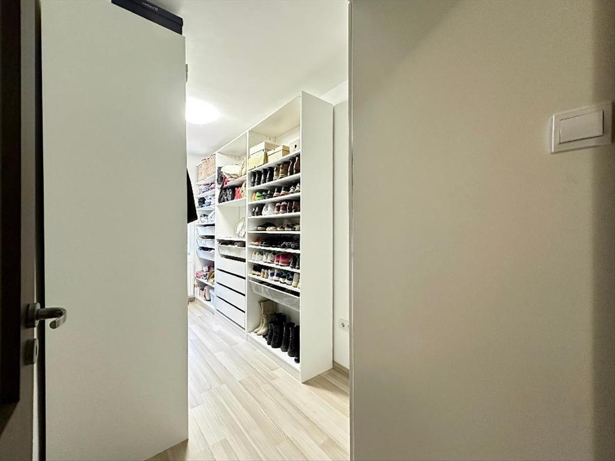 Az egyik szoba jelenleg gardróbként funkcionál (kisebb), másik a hálószoba. Az amerikai konyhás nappaliból nyílik a terasz, mely kellemes adottságot nyújt pihenéshez. Ennek mérete 7, 3 nm a lakás nettó alapterületén felül.
