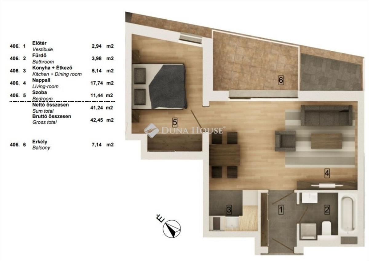 41, 24 m2-es, amerikai konyhás nappali + 1 hálószobás lakás, 7, 14 m2-es fedett terasszal.