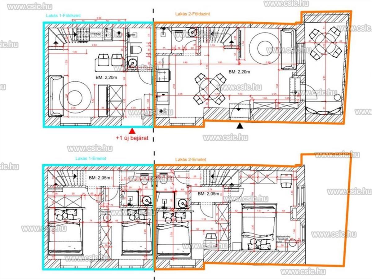 Alsó szinten helyet kapott a nappali, konyha, fürdőszoba és wc. Az emeleten két külön nyíló hálószoba és fürdő+ Wc kapott helyet.