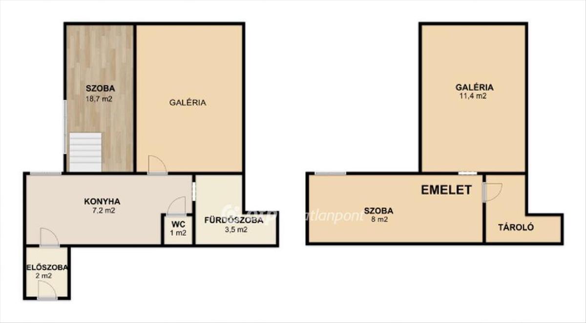 A lakás tulajdoni lap szerint 34 m2-es, 1 szobás, azonban a nagy (4 méteres) belmagasságnak köszönhetően kialakításra került egy 8 m2-es külön bejáratú szoba a konyha felett, valamint egy 11 m2-es galéria a nappaliban. a galérián a belmagasság 1, 8 m.