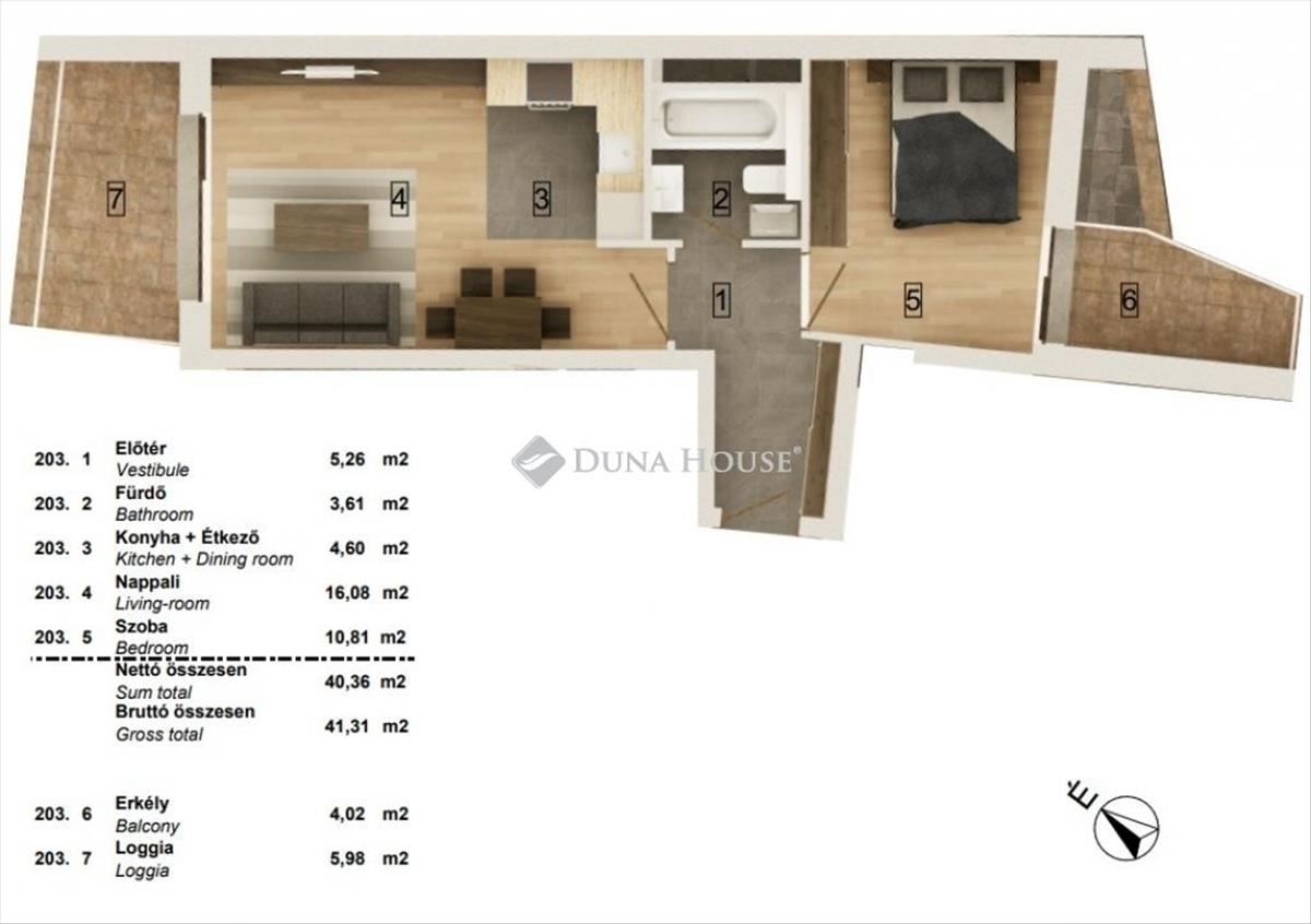 - 40, 36 M²-es amerikai konyhás nappali + 1 hálószoba, összesen 10 m² fedett terasszal