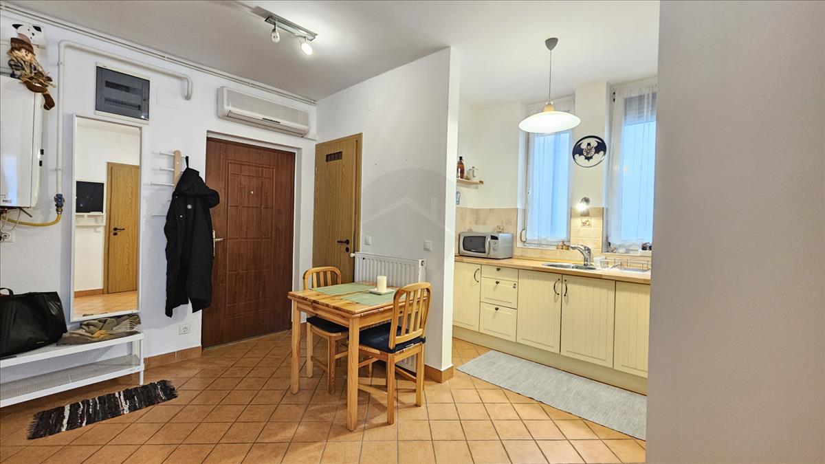 A lakás klimatizált, biztonsági ablakos, redőnyös, utcai nézetű.