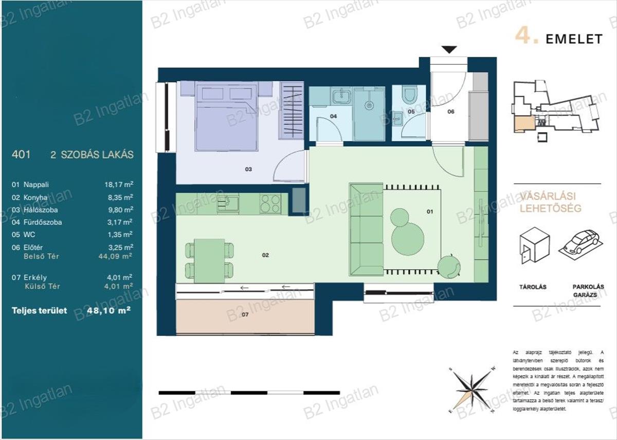 A lakás világos tájolásának és nagy erkélyének köszönhetően kellemes életteret biztosít, modern műszaki tartalommal és alacsony fenntartási költségekkel.