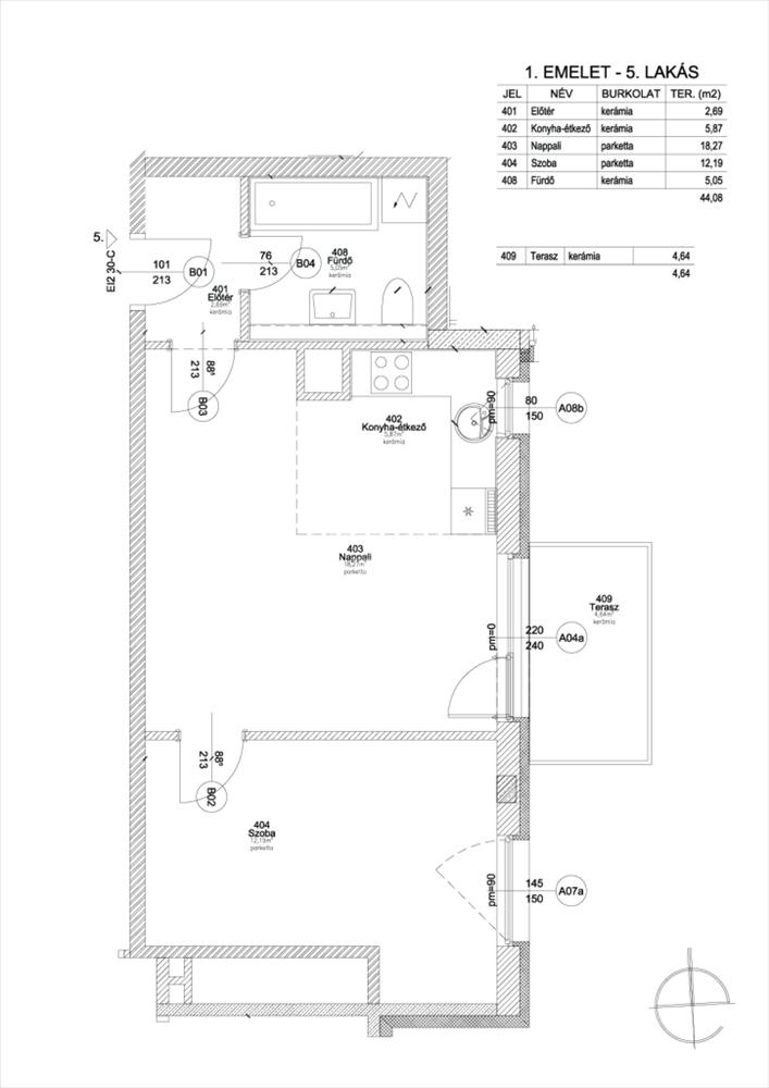 A lakóegységben 40-44 lakás helyezkedik el 2077 nm-en változatos méretekben a 31 nm-től 123 nm-ig az 1 szobástól az 4 szobásig. a kertkapcsolatostól az erkélyesen át a hatalmas tetőteraszosig.
