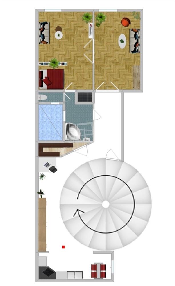 Egy ötletes kialakítással a konyha és étkező átkerülhet a félkörívbe, így a meglévő konyhából egy harmadik szoba alakítható ki, csendes, zöld udvarra néző kilátással.