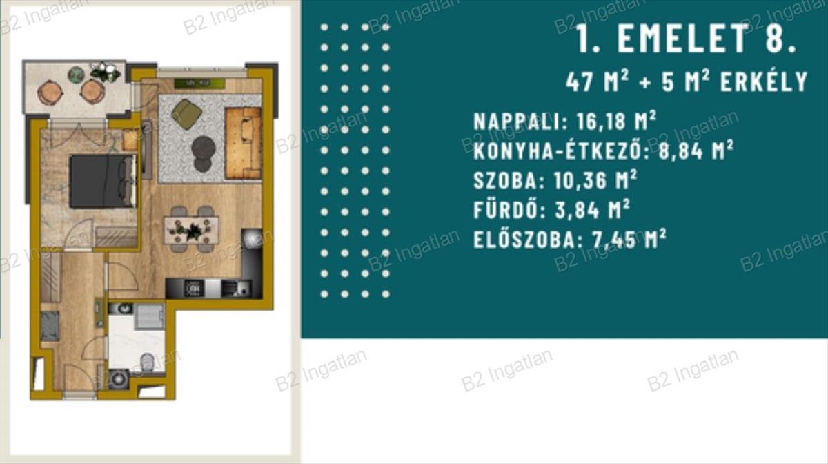 A tágas, amerikai konyhás nappali kényelmes életteret kínál, amely közvetlenül kapcsolódik a 4, 84 m²-es erkélyhez – ez a kellemes kültéri rész kiváló helyszín reggeli kávéhoz vagy esti pihenéshez. A külön hálószoba biztosítja a nyugodt, intim pihenést, míg a modern, zuhanyzós fürdőszoba és az előszoba praktikus tárolási lehetőségei a mindennapi kényelmet szolgálják.