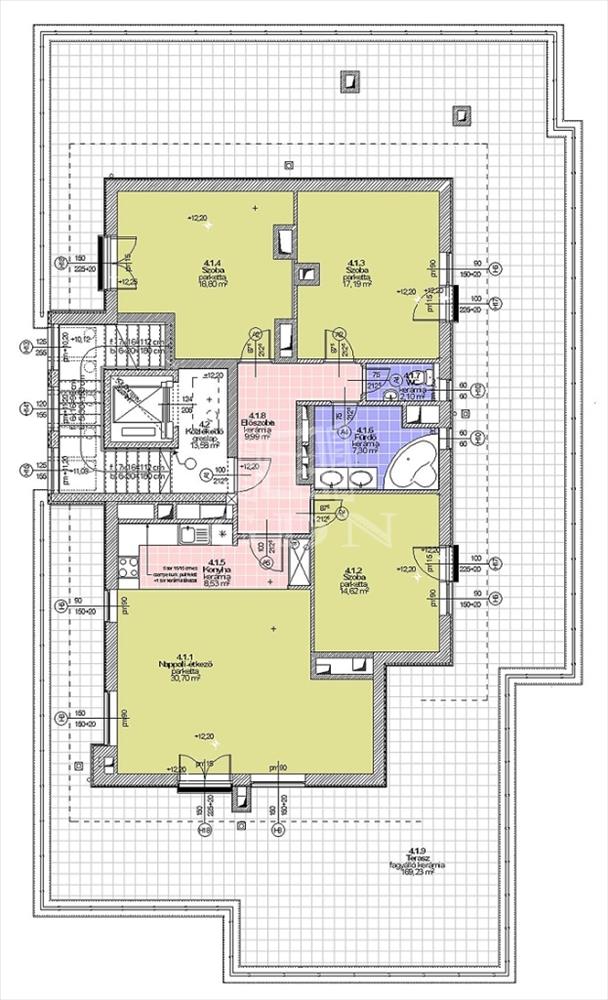Tetőterasz: 170 m², körbefutó, napfényes