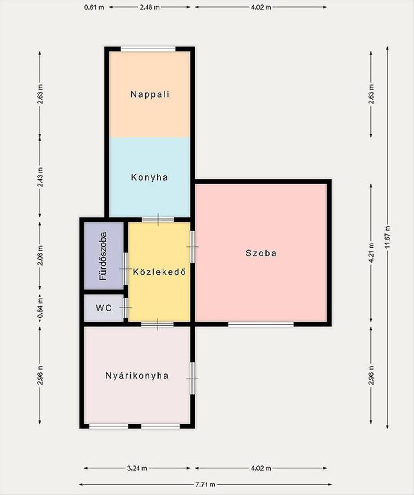 A lakás jó elosztású, tulajdonlap szerint 38nm -es, azonban egy átalakítással 2 különnyíló szobássá alakítható, ugyanis a lakáshoz hozzá lett építve egy kb. 8Nm-es nyári konyha, ami ki tudja váltani a jelenleg konyha-nappaliként használt helyiséget.