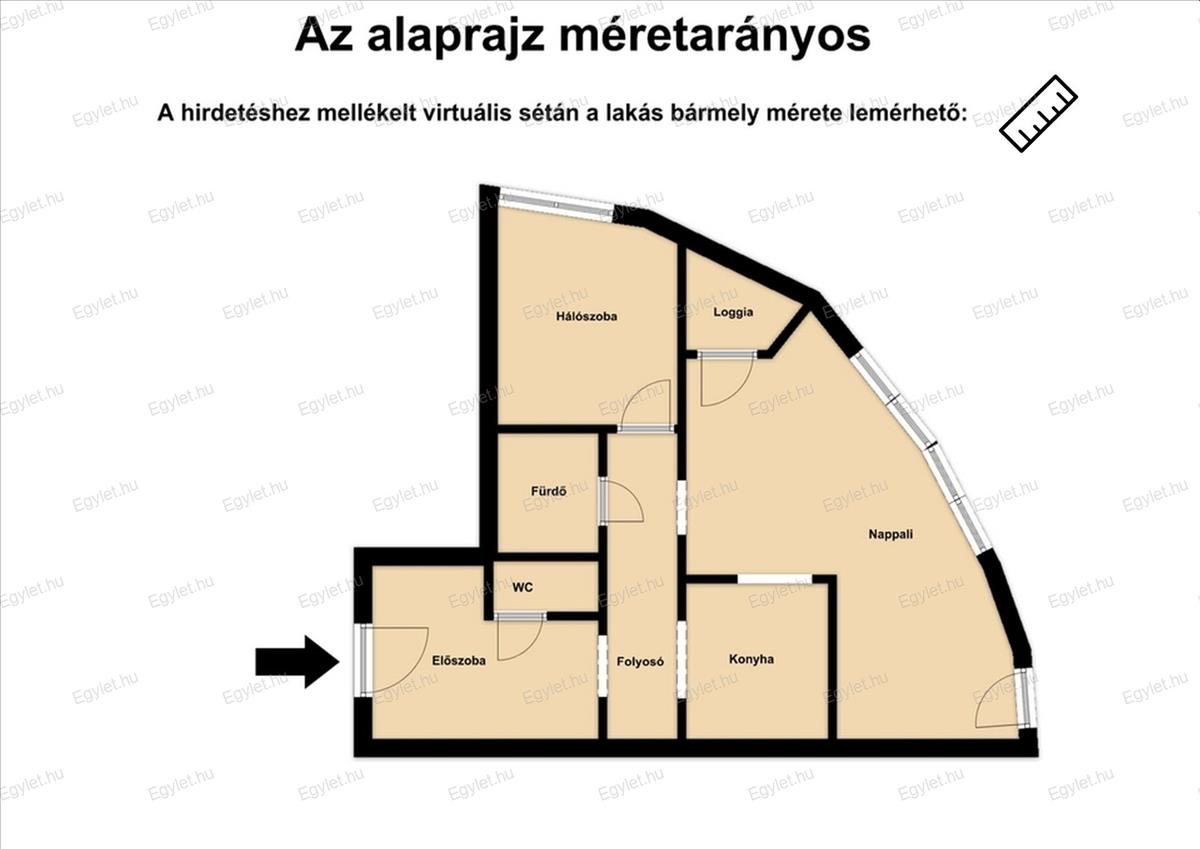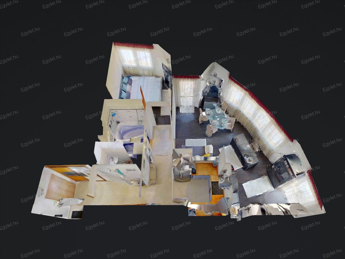 •Egyedi forma: a lakás alaprajza egy „tortaszeletre” emlékeztet (negyed körcikk), ami rendkívül izgalmas belső tereket eredményez.